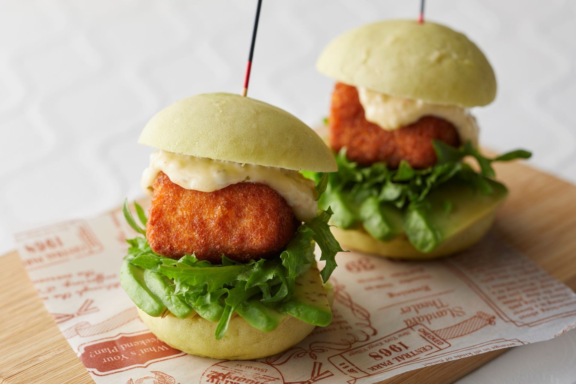 香ばしくカリッと焼き上げた肉厚サーモンを挟んだボリューム満点のハンバーガー。健康食として人気の高いアボカドやレモンの皮を混ぜ合わせ特製タルタルソースで爽やかさもプラス。ほうれん草を練り込んだ緑色のバンズで見た目も可愛く仕上げました。