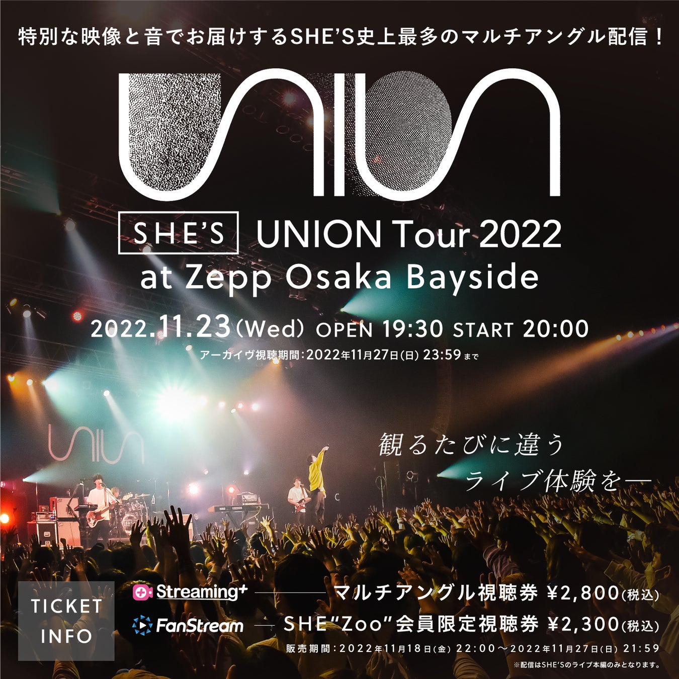 本配信は「SHE'S UNION Tour 2022」初日大阪公演のある1曲のみをファン全員が撮影OKとし、一部のファンが撮影した映像をマルチアングル映像の一部として採用し配信するという大変画期的でチャレンジングな企画です。