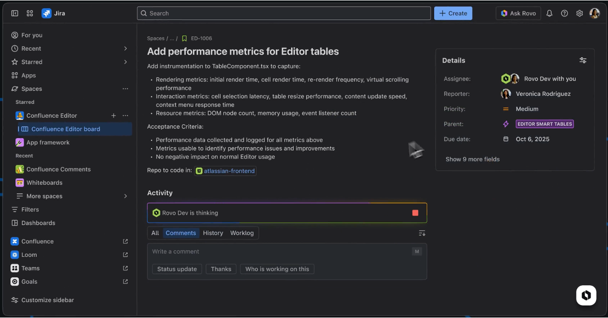 Rovo Devは、開発者の作業全体を理解しサポートするAIエージェントです。Atlassian Teamwork Graphを基盤に、企業やプロジェクトの目標を把握した上で、アトラシアンのタスク管理ツールであるJiraやナレッジ共有プラットフォームであるConfluenceなどのツールと横断的に連携します。Rovo Devは、コードだけでなく、ビジネスの背景やドキュメント、チケット、コードの履歴なども統合し、開発者が常に全体像を把握できるようにします。