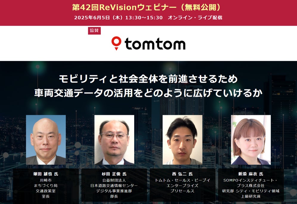 【無料WEBセミナー】トムトム、川崎市、日本道路交通情報センター、SOMPOインスティチュート・プラスから講師を迎え、「モビリティ、社会、車両交通データ活用」をテーマにライブ配信 ― 6月5日(木)