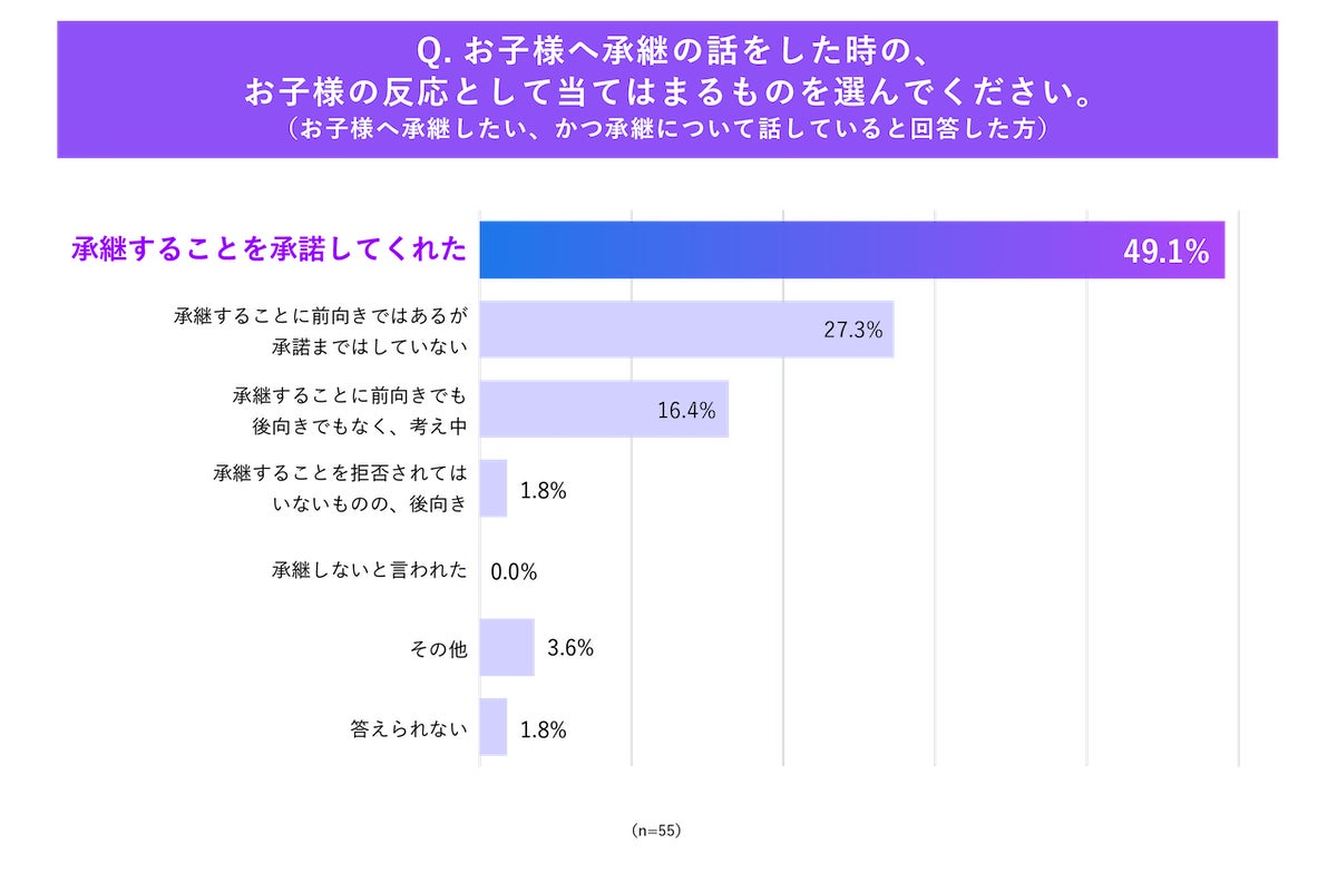 その一方で、子どもに承継させたいと考えている経営者は、子どもと承継についてきちんと話をしている割合が高く、「承継することを承諾した」という反応が多かったことから、事業承継の準備が進んでいるということがわかります。
