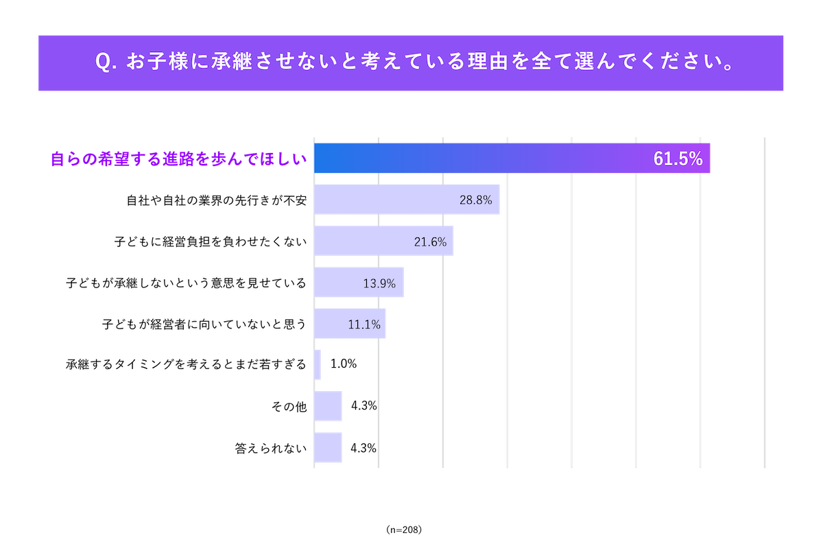 多様な進路があるなかで、子どもの意志を尊重し自身が望む道を歩んでほしいという経営者である親の考えがみられます。また、自社や業界の先行きに不安を抱えており、そのような状態で負担を負わせたくないという考えも一部うかがえます。
