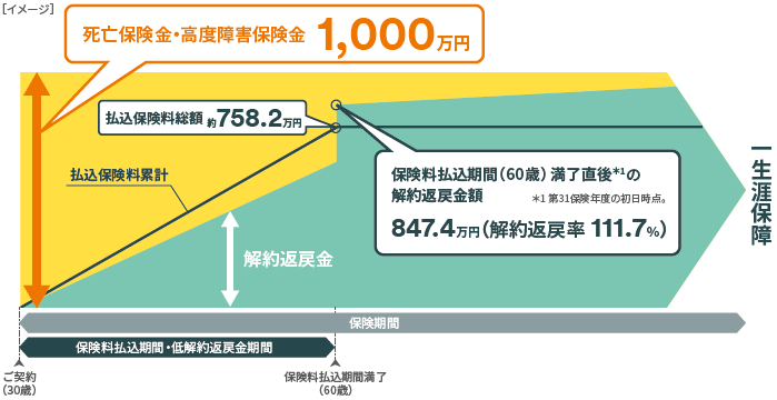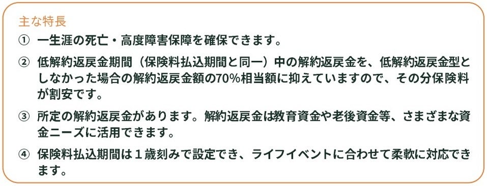 本商品は、保険料の負担を抑えた一生涯の死亡保険です。また解約返戻金はさまざまな資金に活用いただけます。特にニーズの高い、お子さまの教育資金やセカンドライフのための老後資金の準備にも対応するプランの設計が可能です。