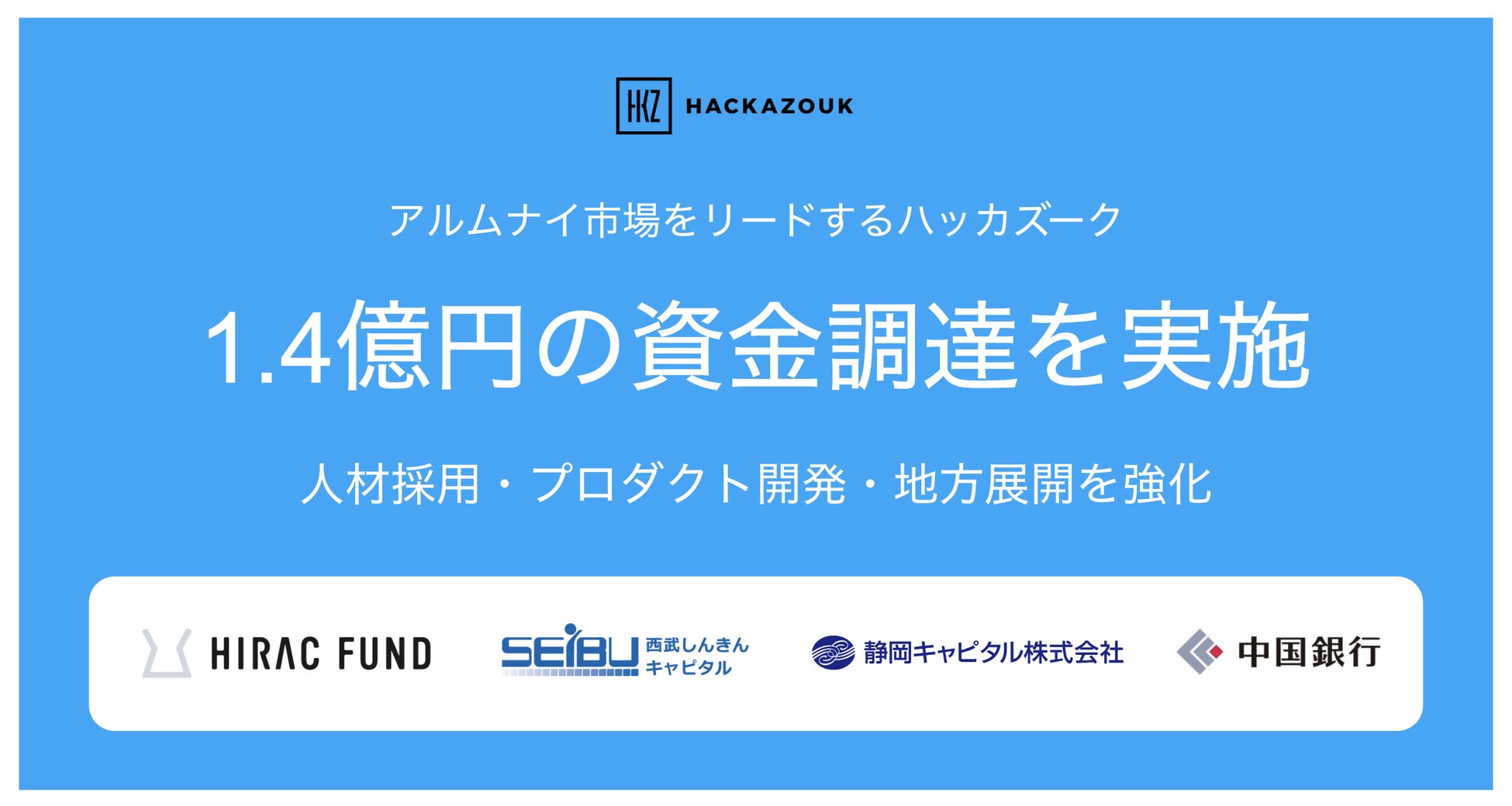 企業向けアルムナイ専門サービスシェアNo1(*1)の『Official-Alumni.com(オフィシャル・アルムナイ・ドットコム)』を提供する株式会社ハッカズーク(本社:東京都、代表取締役CEO 鈴木仁志 以下ハッカズーク)は、マネーフォワードベンチャーパートナーズ株式会社が運営するHIRAC FUND1号投資事業有限責任組合(以下HIRAC FUND)をリードインベスターとして、西武しんきんキャピタル株式会社、静岡キャピタル株式会社、株式会社ちゅうぎんキャピタルパートナーズそれぞれが運営する投資事業有限責任組合、および2名の個人投資家を引受先とした第三者割当増資で1.4億円の資金調達を実施しました。アルムナイの普及により「退職で終わらない企業と個人の新しい関係」を実現するために、人材採用の強化とプロダクト開発に積極的に投資をしてまいります。また、新たに株主として加わった静岡銀行グループと中国銀行グループとの連携により、東海、中部、近畿、中国、四国地方でのサービス展開も強化します。