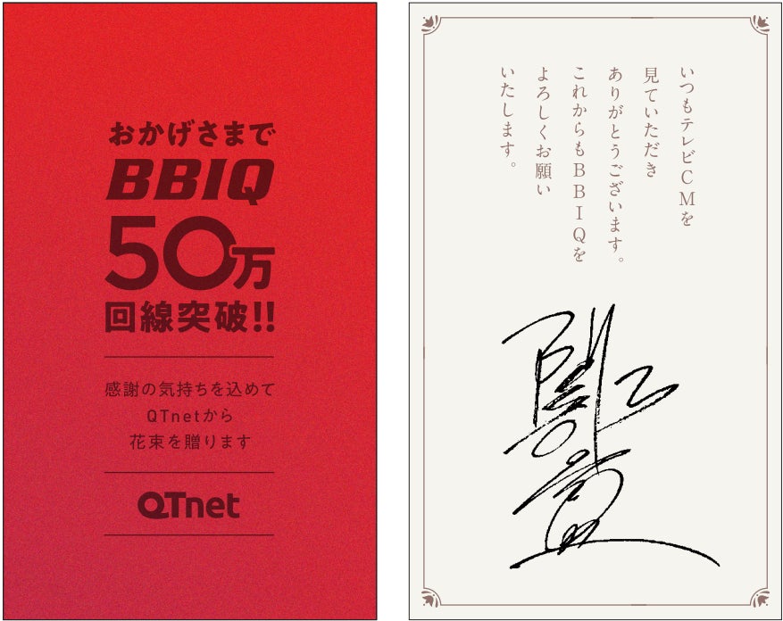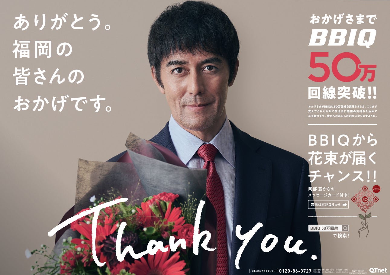 そしてBBIQでは50万回線突破を記念し、11月25日から「阿部さんづくしなキャンペーン」を実施。期間限定スペシャルサイトで、ここでしか見られない阿部さんのメッセージ動画や、阿部さんの18年間のTVCMを振り返るヒストリー動画を配信します。また、九州の皆さまへの感謝の気持ちを込めたサイン入りメッセージカードと花束が当たるスペシャルな企画や、光インターネットサービスBBIQをご利用の方向けには旅行券や人気家電が当たるBBIQ50万回線突破キャンペーンを実施。さらに九州各県では阿部さんの特大ポスターを掲出します。福岡県の西鉄福岡(天神)駅、JR博多駅ではその場でソープフラワーがもらえるピールオフ広告も実施します。
