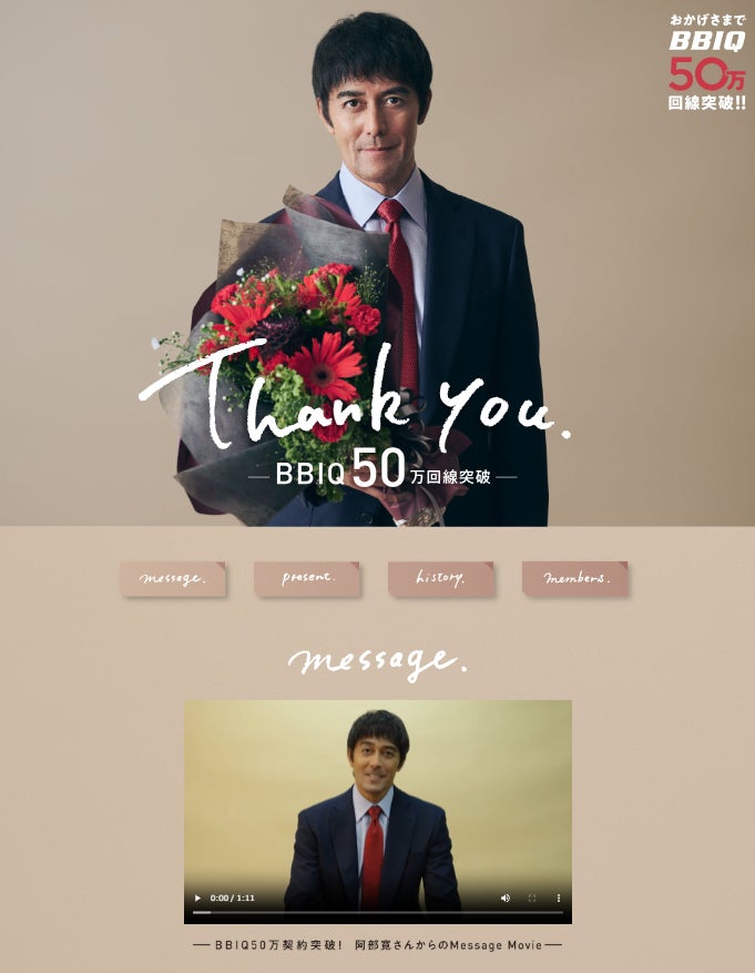BBIQは、50万回線突破を記念して、11月25 日(月)から12月27日(金)の期間でプレゼントキャンペーンを開催します。本キャンペーンでは抽選で合計50名様に、阿部寛さんからのメッセージカード付の花束が当たります。また、キャンペーンスペシャルサイトでは阿部さんからの限定メッセージや18年間出演しているTVCMを振り返るヒストリー動画も限定公開いたします。