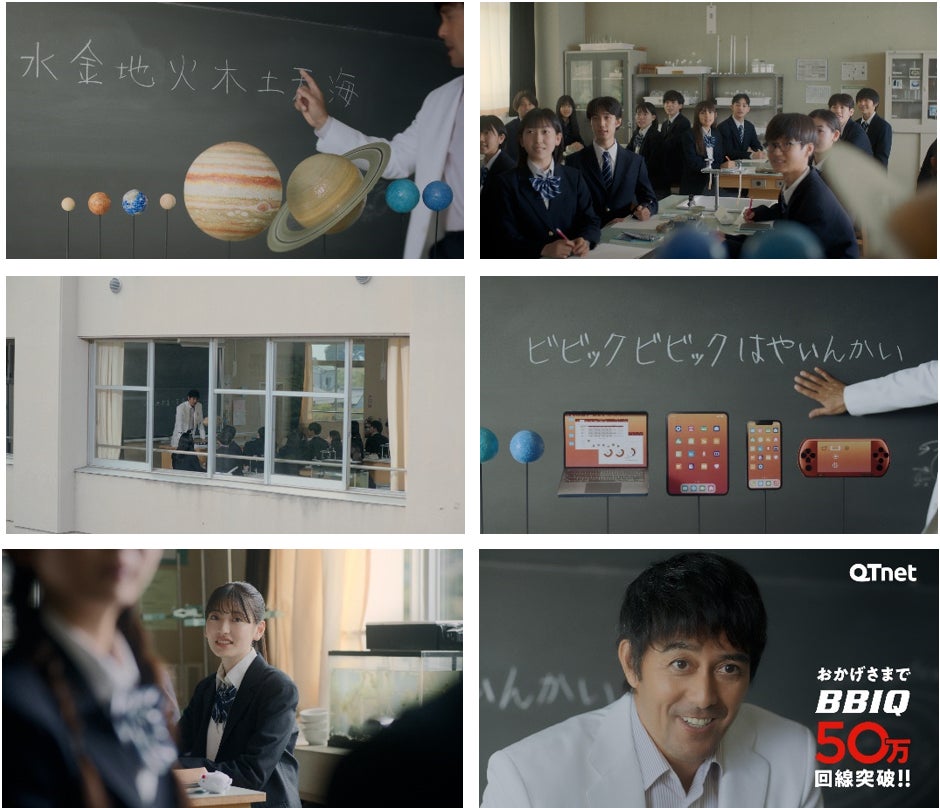 今回のCMコンセプトは「学校シリーズ」。本作も阿部さん演じる教師が真面目に授業を行っている最中、突如語呂合わせに乗せてBBIQやQTモバイルのサービスの魅力をアピールしはじめます。あえて前作のCMと同様、だれもがきっと覚えた語呂合わせのフレーズを採用。自信満々の阿部先生と生徒たちの掛け合いがコミカルな「九州の新常識」シリーズのCM展開となっています。