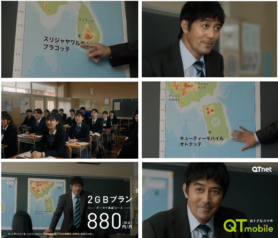 こちらは地理の授業風景です。ここでも教師役を演じる阿部さんは、黒板に張り出した地図に記されているスリランカの首都名、「スリジャヤワルダナプラコッテ」を生徒たちに教えています。すると今度は別の地図を黒板に張り出しますが、記されているのはどことなくスマートフォンのシルエットに似た謎の島。そこには「キューティーモバイルオトクッテ」の文字が記されています。阿部さんは何のためらいもなく、「キューティーモバイルオトクッテ!」と生徒たちに投げかけます。生徒たちも阿部先生につられて「キューティーモバイルオトクッテ!」と声高にリピートします。冷めた女子高生は「さすがに無理じゃね?」とツっこみます。阿部先生はお構いなく、「親御さんにも言っとけよぉ!」と押しの一言で締めくくり、BBIQに引き続き、どこか親しみのある可笑しなフレーズと空気を読まない阿部先生のコミカルな演技が魅力のQTモバイルのCMとなっています。