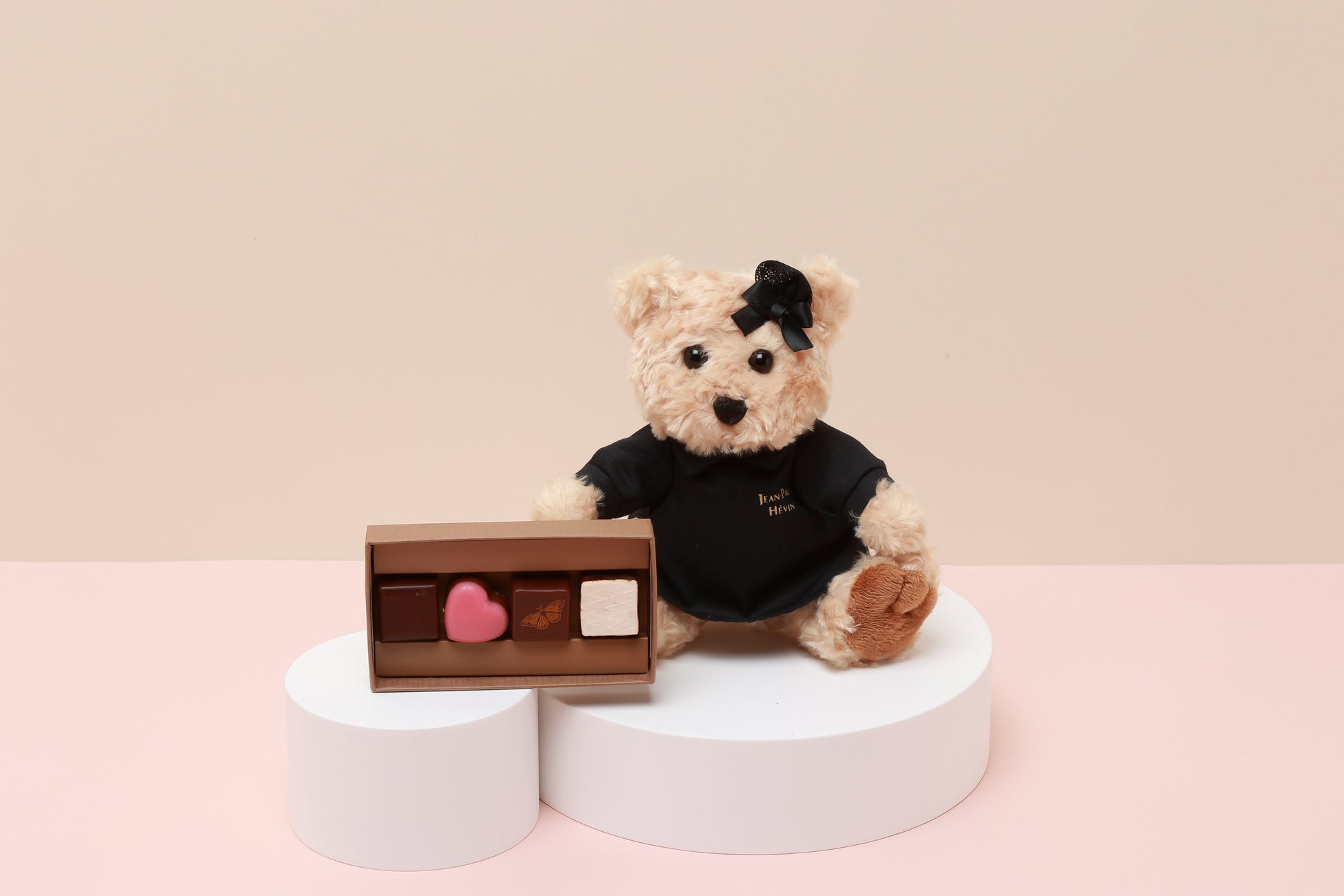 メースの上品な香りが味覚に新しい喜びをもたらす新作の「パピヨン」、期間限定の「JPH ヌガー ノワール」、「クール レ ローズ 2023」を含むボンボンショコラ4個と、頭にシニョンを付け、ワンピースを身にまとったテディベアのセット。