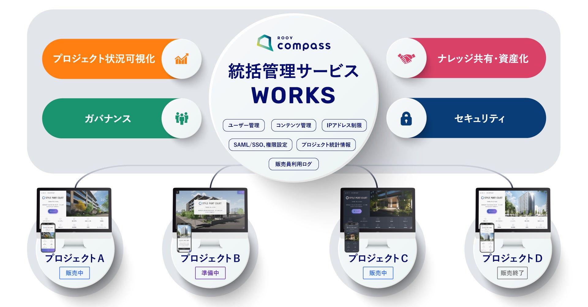 そのような状況に対しスタイルポートは、『ROOV compass』を統括管理するサービス「WORKS」を新たに開発し、プラットフォームとして横断的なプロジェクト管理を実現しました。従来、部分最適化されてきた販売手法・ナレッジを全社共有資産として活用するだけではなく、昨今強化されているガバナンスやセキュリティ面での全体最適化に向けた取り組みを販売現場の負担なく可能にしています。