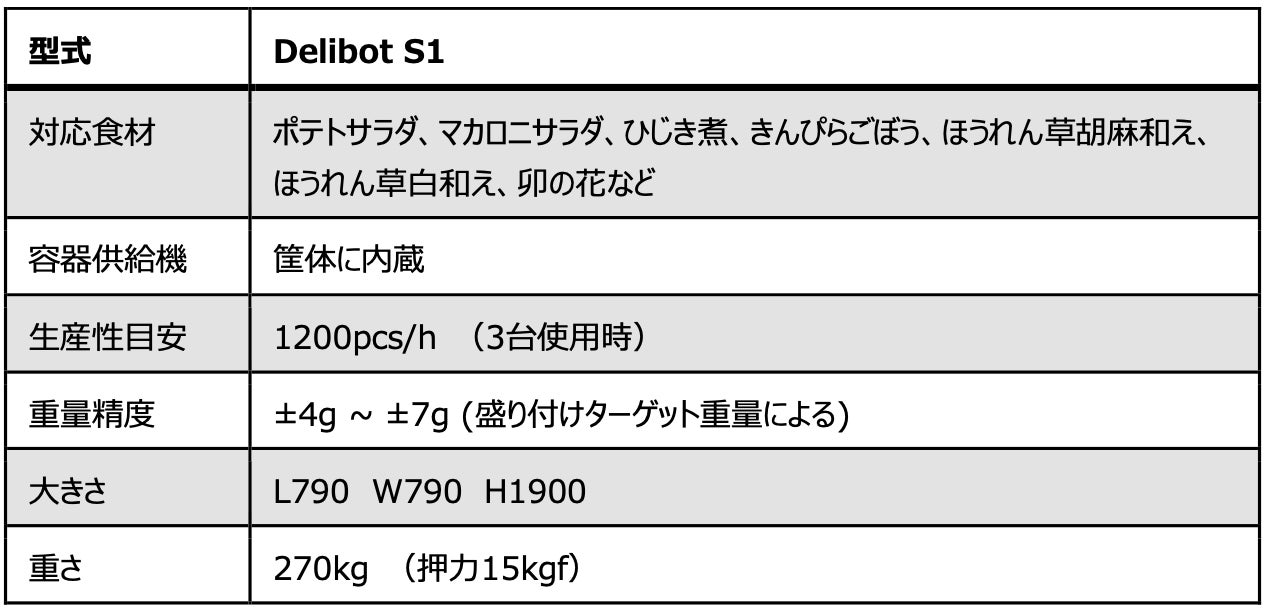 ■汎用型 惣菜盛付ロボット「Delibot S1」の主な仕様