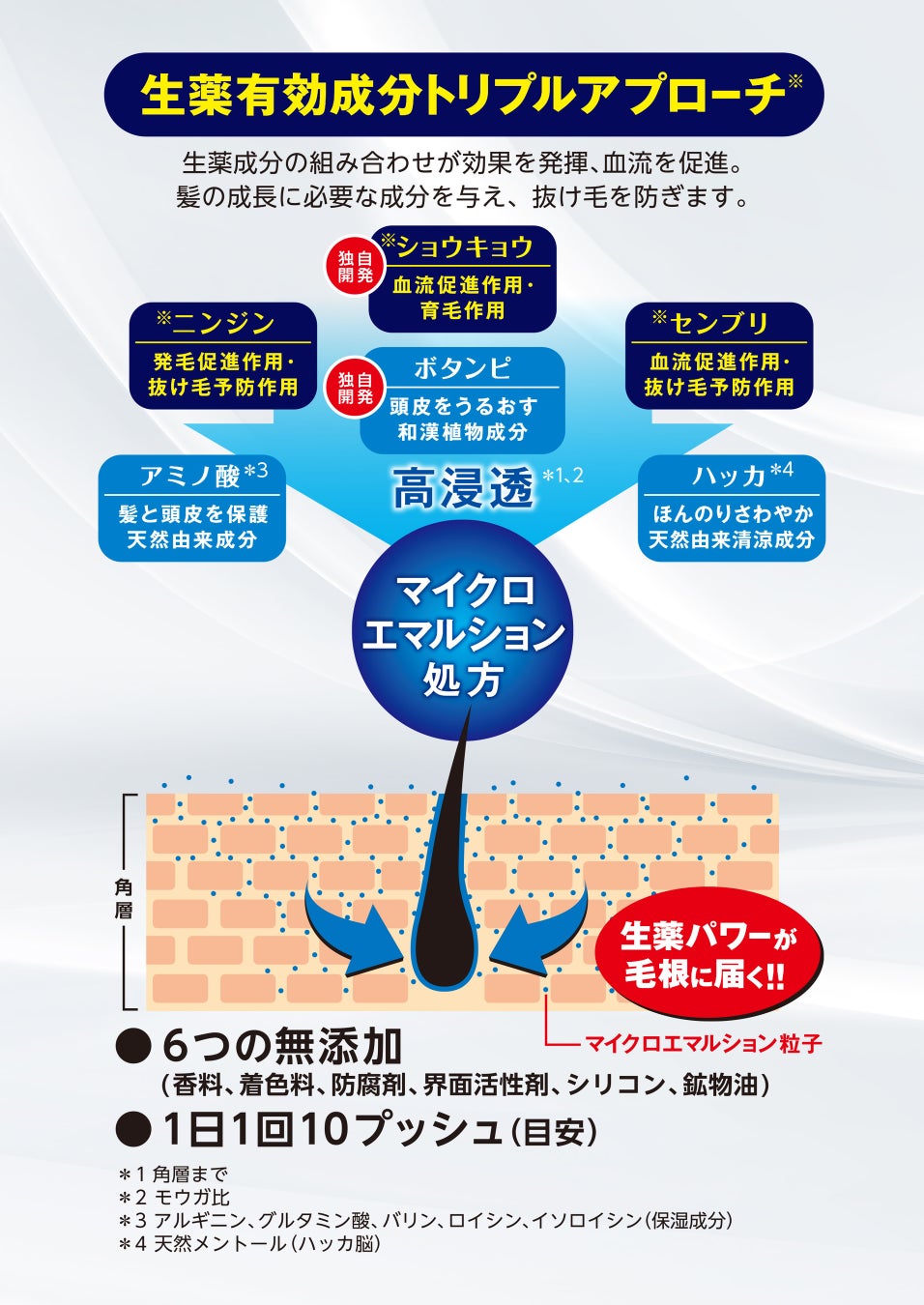 *1:角層まで *2:モウガ比 *3:独自開発ショウキョウチンキ・ニンジンエキス・センブリエキス
