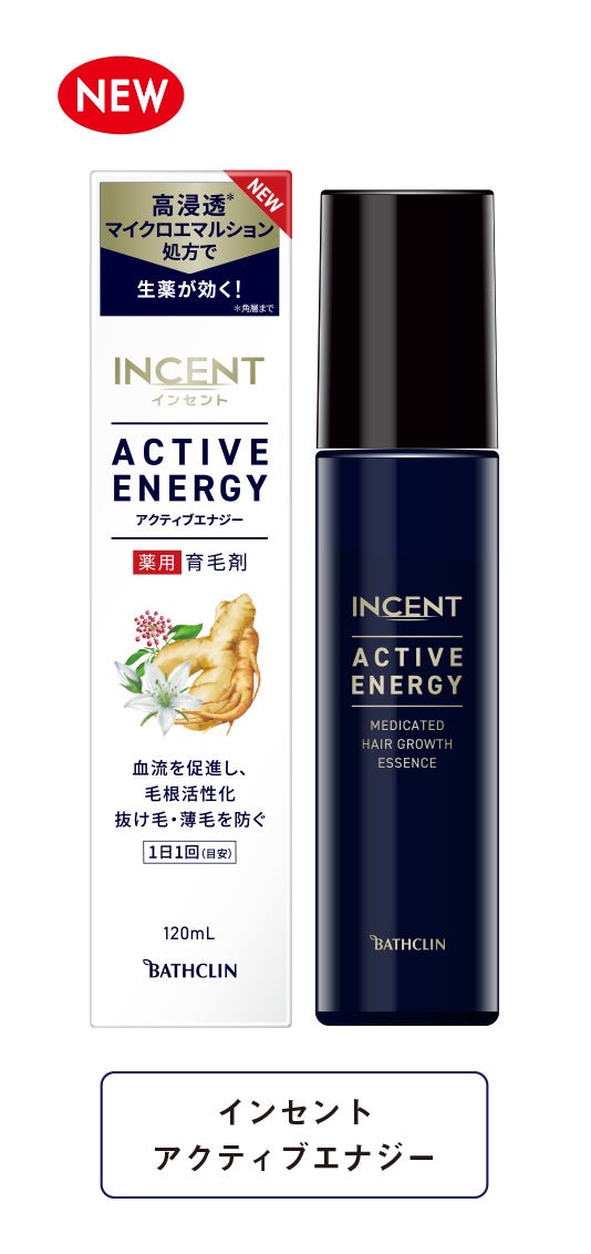 このたび、抜け毛の進行を食い止めたいと考える本格的な育毛ケアに関心がある方に向けて、1日1回(目安)の手軽さで、血流を促進し毛根を活性化、抜け毛・薄毛を防ぐ「インセント アクティブエナジー」を新発売いたします。