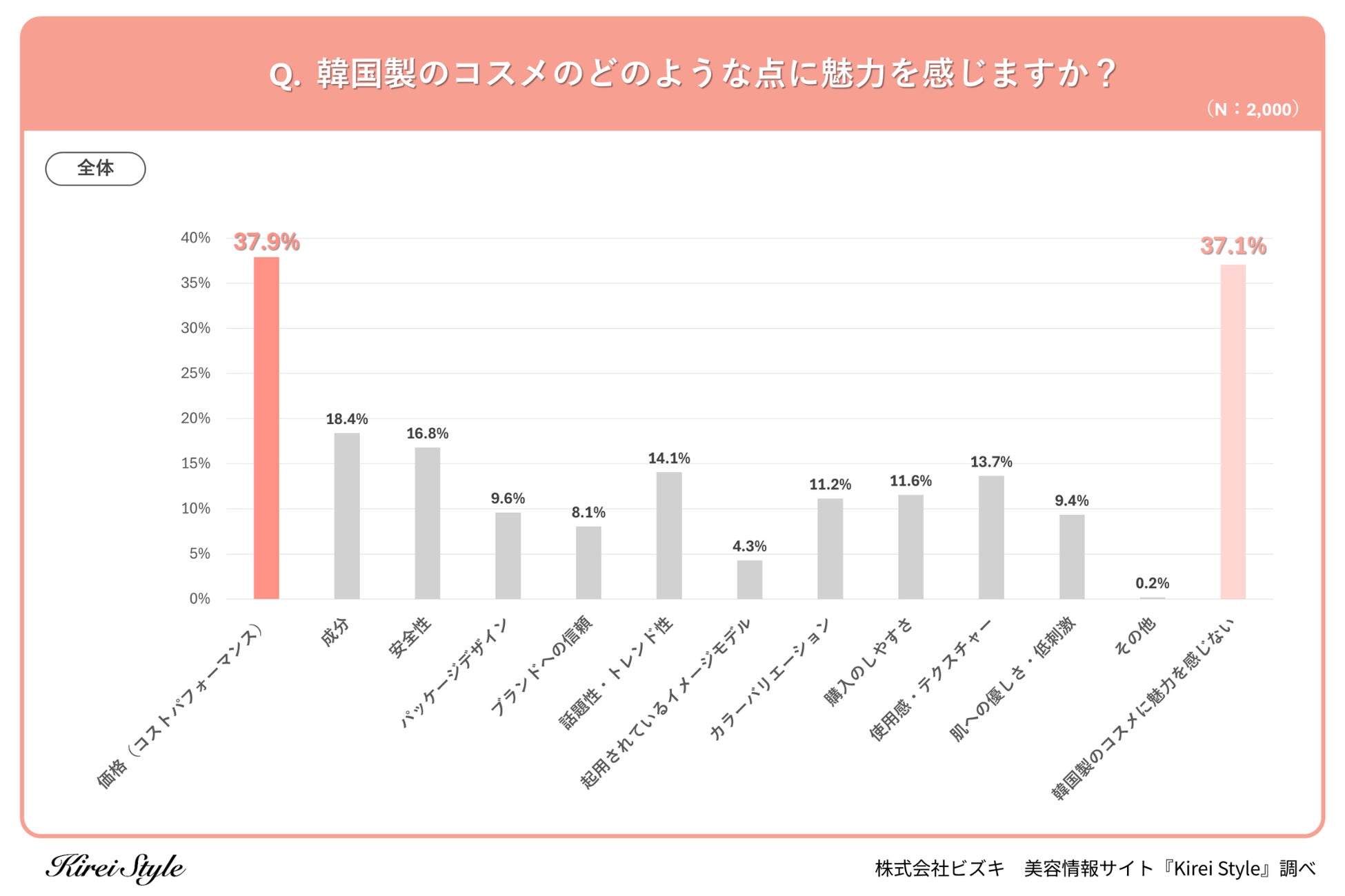 20歳〜59歳の女性2,000人に「韓国製のコスメのどのような点に魅力を感じますか?(複数回答可)」と尋ねたところ、最も多かった回答は「価格(コストパフォーマンス)」で37.9%となりました。