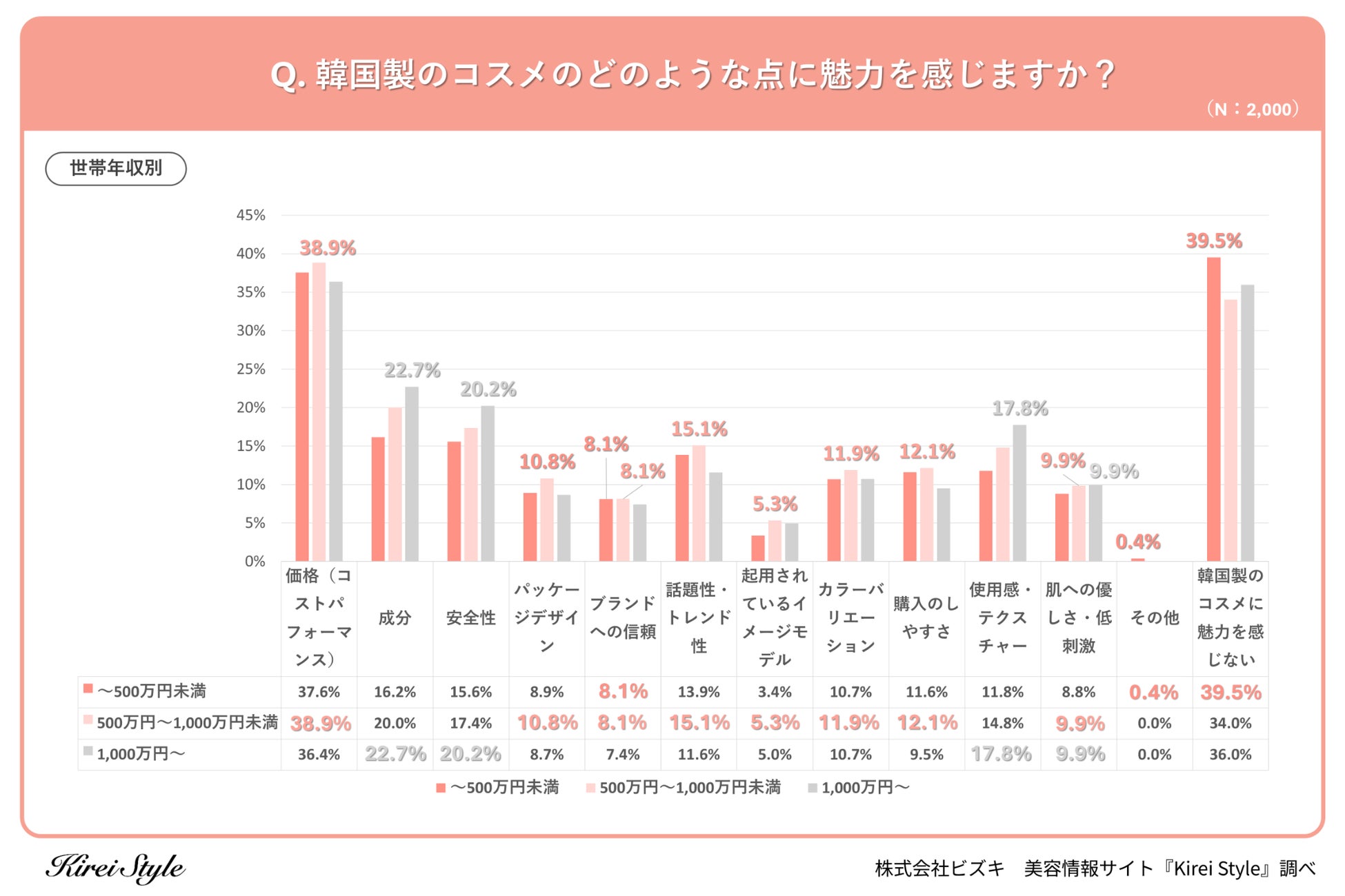 韓国コスメの魅力ポイントを2,000人に調査!1位『価格(コスパ)』に迫る2位は『魅力を感じない』がほぼ同率で続く意外な結果に!