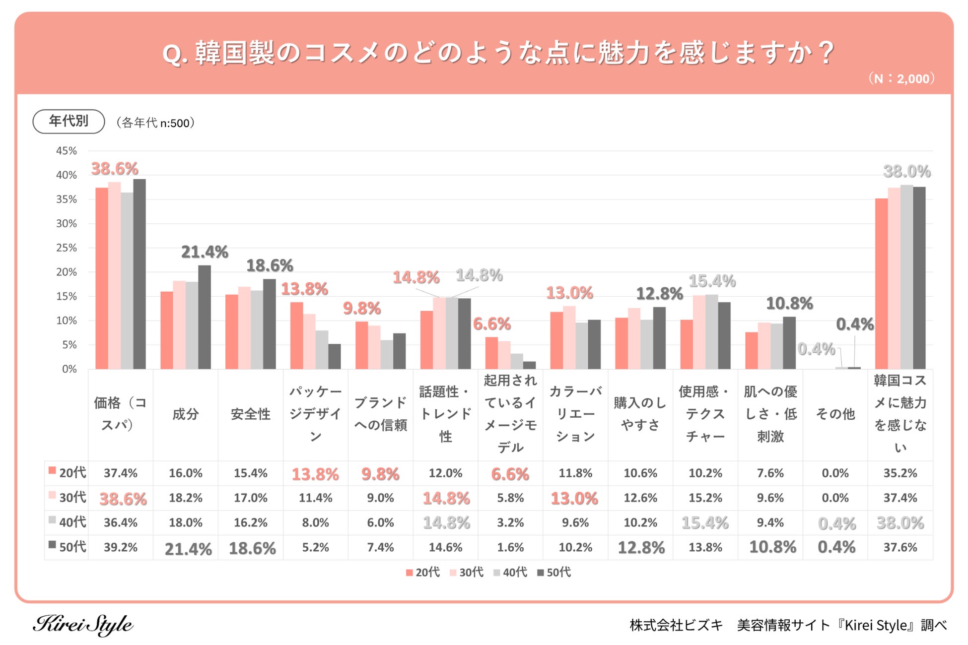 なお、「価格(コストパフォーマンス)」については、全年代を通して36%~39%台と高い水準を維持しており、年代問わず韓国コスメの最大の魅力となっていることが分かりました。