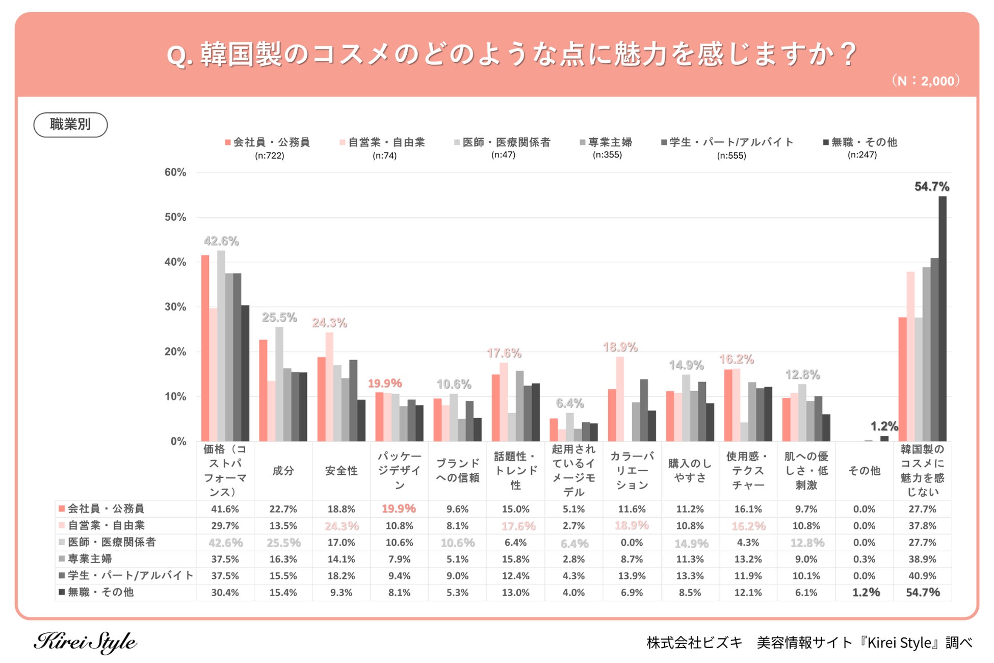 職業別で見ると「価格(コストパフォーマンス)」を魅力に感じる割合が他の職業より高かったのは、「医師・医療関係者」で42.6%、「会社員・公務員」で41.6%という結果になりました。また、「成分」を韓国コスメの魅力として回答したのも「医師・医療関係者」が25.5%で最も多い結果に。贅沢な成分処方でありながらリーズナブルな価格で手に取ることができる韓国コスメのコストパフォーマンスの高さを評価していることが推察されました。