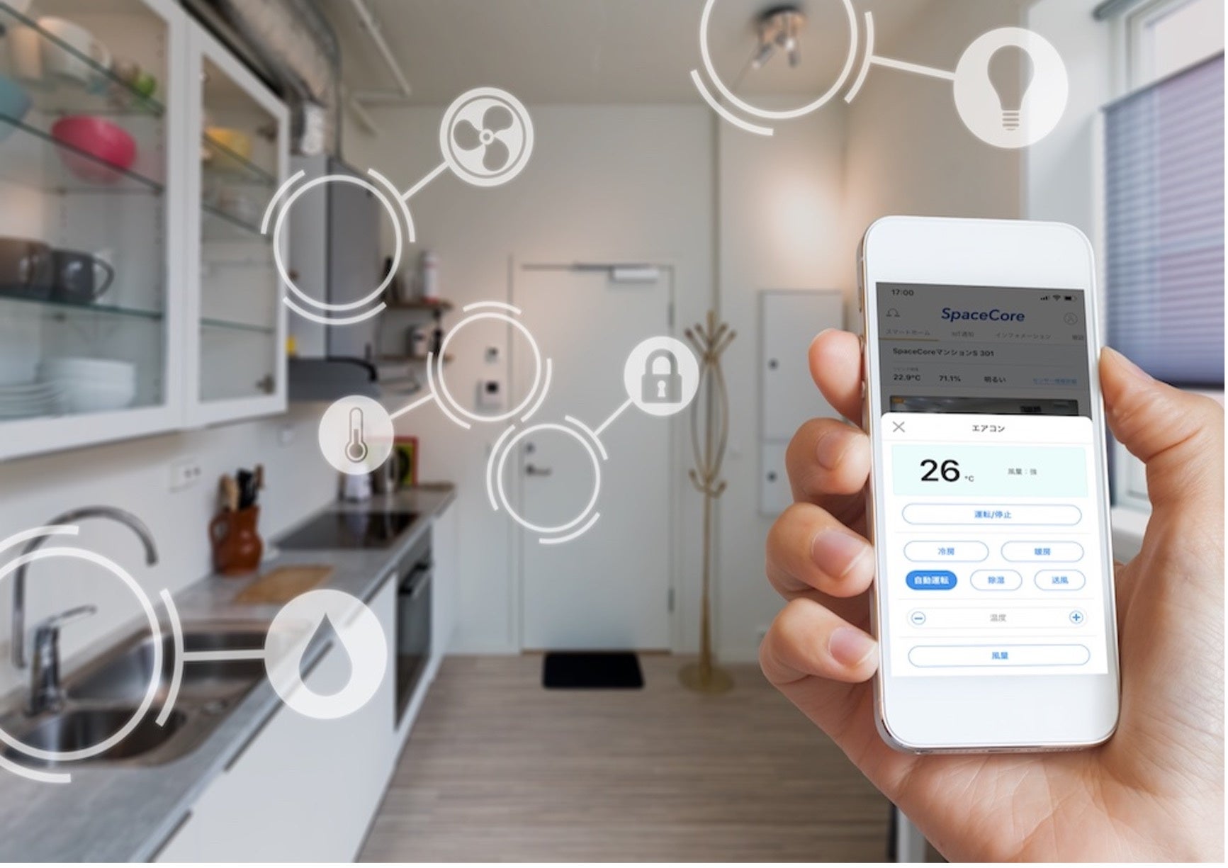 「SpaceCore(スペース・コア)」は、不動産会社やハウスメーカー等の住宅・不動産事業者(以下、事業者)と居住者・オーナーのためのスマートホームサービスです。2019年8月より提供を開始して以来、全国150社以上、約18,000※戸に導入されております。スマートホーム機器を設置し、専用アプリで家電製品や住宅設備が連動するオートメーション化や遠隔操作可能になる「スマートホーム機能」、物件のオーナーや居住者との契約事や日々のコミュニケーションが円滑におこなえる「リレーション機能」、住んでいる地域に関するさまざまな生活サービスをユーザーが利用できる「生活サービス機能」を備えています。これらの機能を一元化し、事業者と居住者の双方が活用できるクラウドサービスおよびアプリとして提供しています。