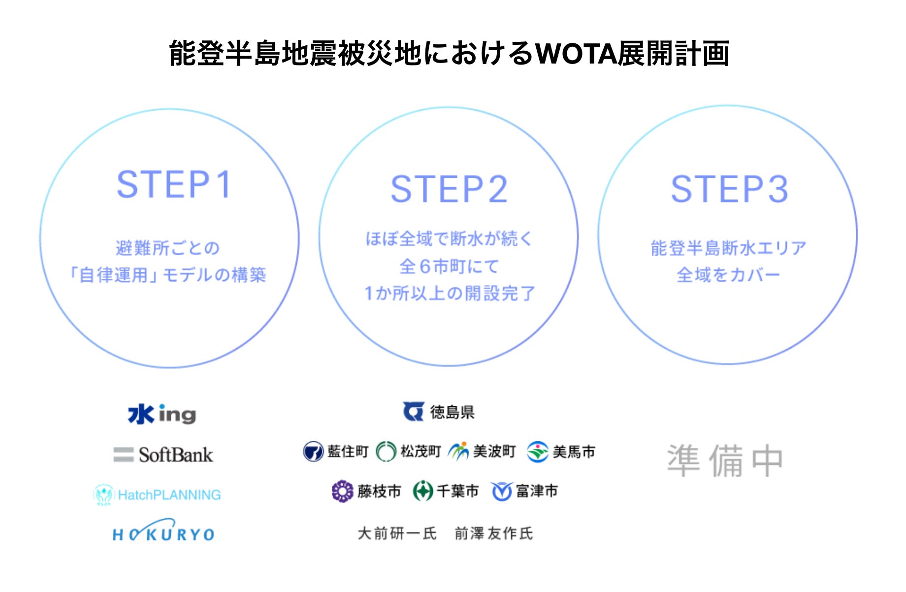 STEP1である避難所ごとの「自律運用」モデルの構築完了と、STEP2である6市町にて1か所以上でのWOTAシステム展開完了見込みのお知らせ