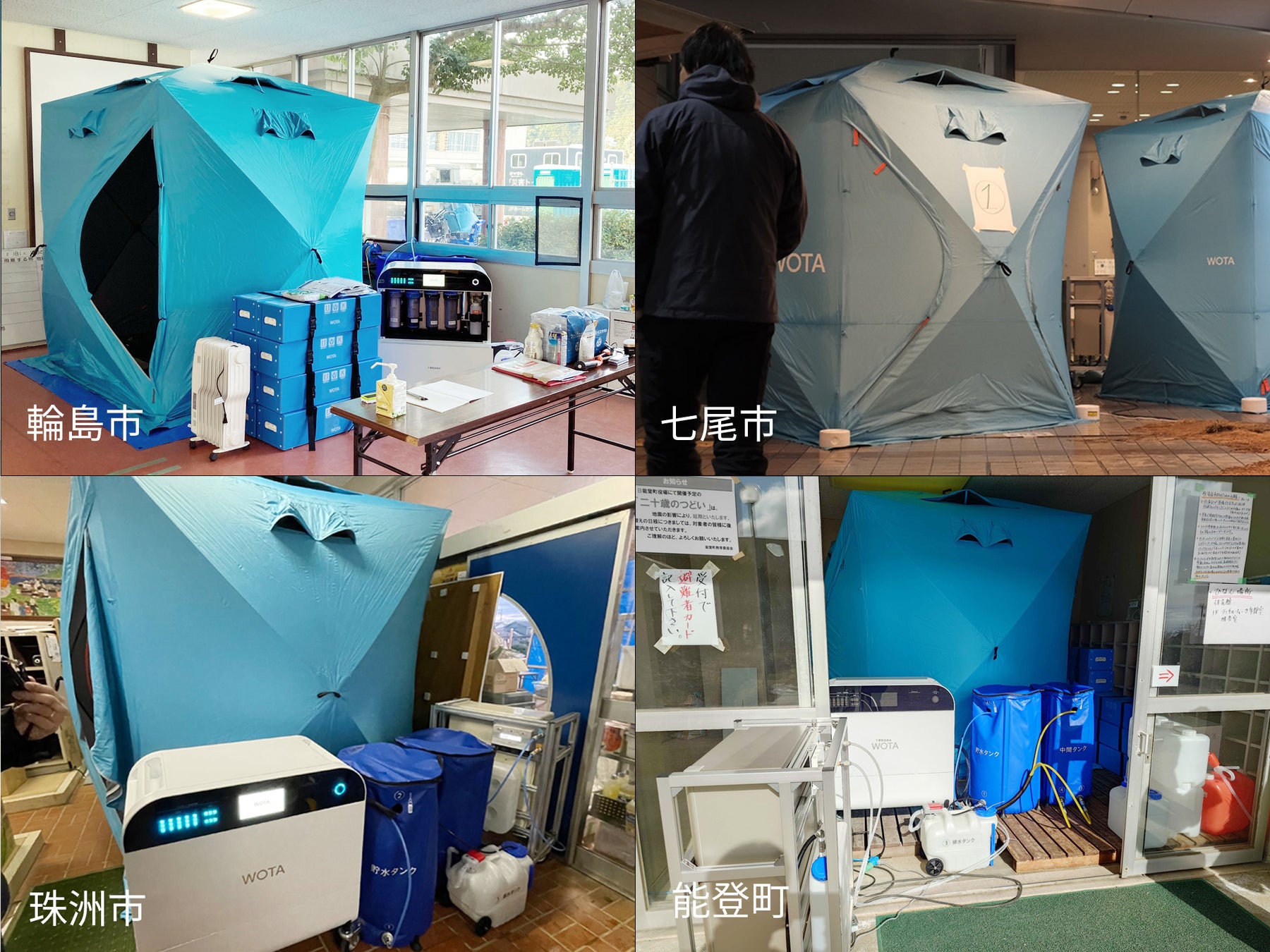 多数の自治体、民間企業、個人からのWOTAシステムの無償提供と、避難所の方々による「自律運用」により、能登半島地震断水エリア全域カバーに向け、入浴、手洗い提供のカバーを加速して参ります。