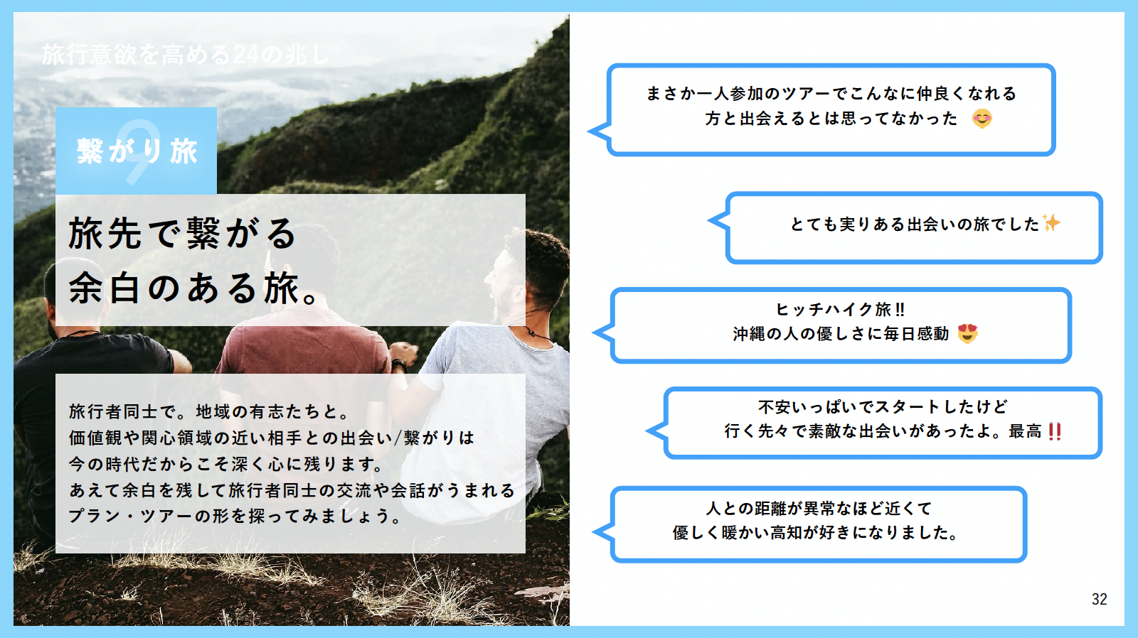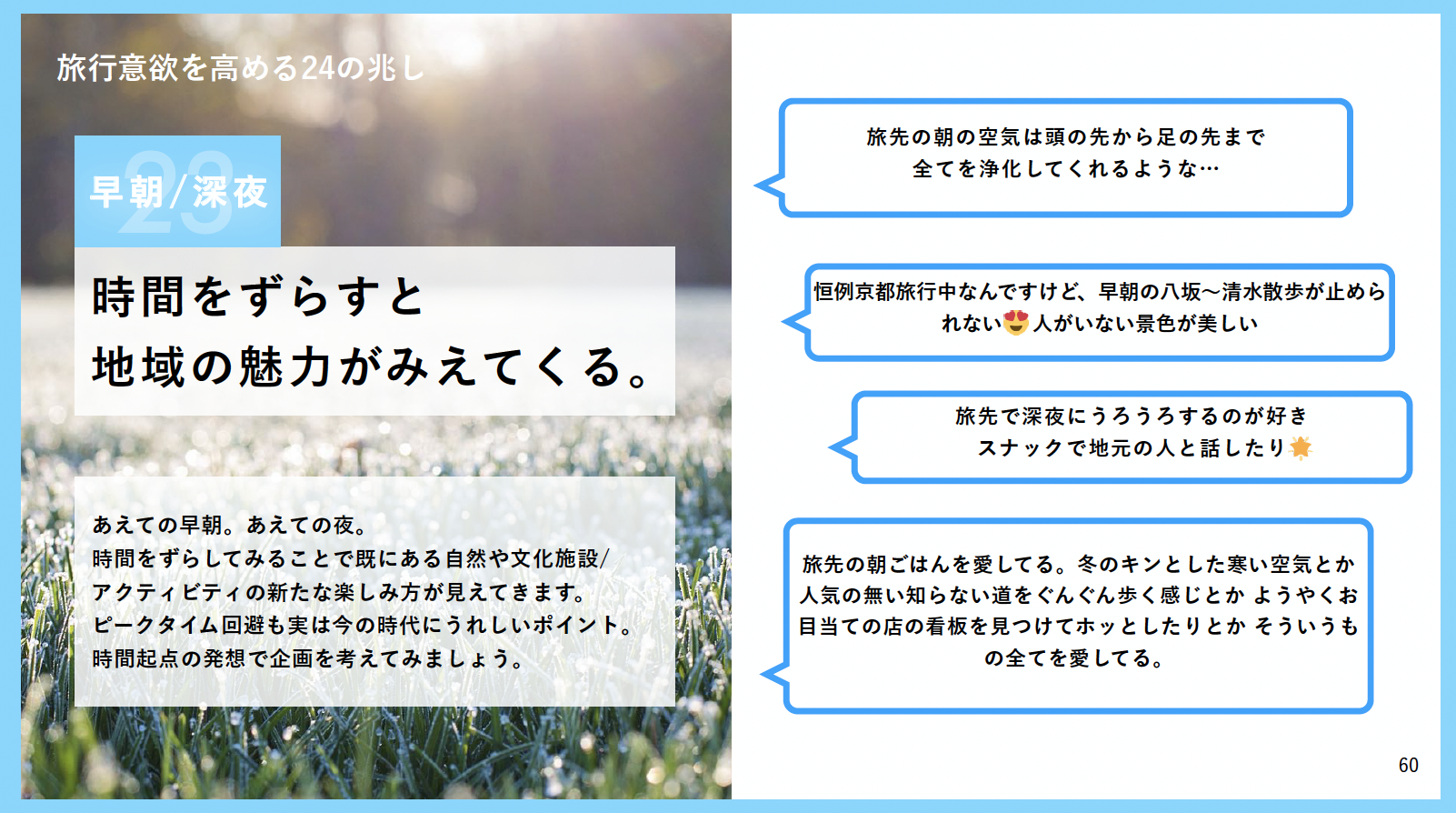 そんな人々が求める「旅の目的」として「旅行意欲を高める24の兆し」を紹介しています。また、具体的な実施施策についても、24の兆しに対して各2件ずつの48件の事例を紹介しています。兆しの指す意味を実際の事業者が実施した企画を知ることで、ガイドをお読みいただいた事業者の方々が、よりイメージしやすく企画に落とし込むことができるようになっています。