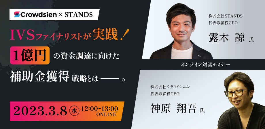株式会社クラウドシエン(本社:広島県広島市、代表取締役:神原翔吾)は、株式会社STANDS(本社:東京都中央区、代表取締役:露木 諒)と共催で、2023年3月8日(水)1億円の資金調達に向けた補助金獲得戦略をテーマにウェビナーを開催します。