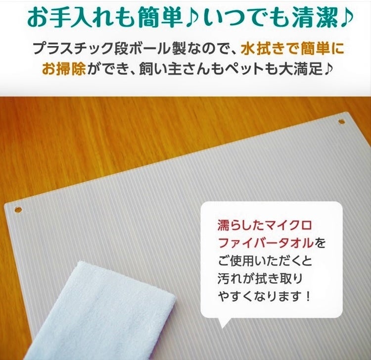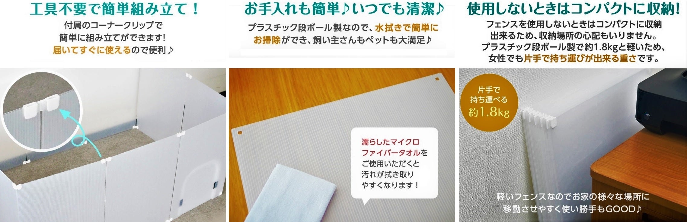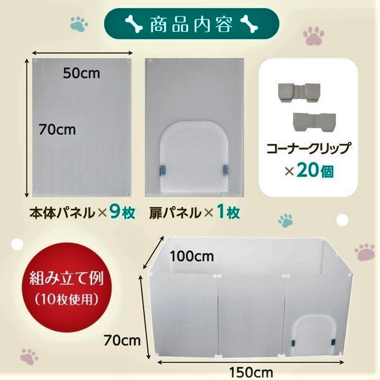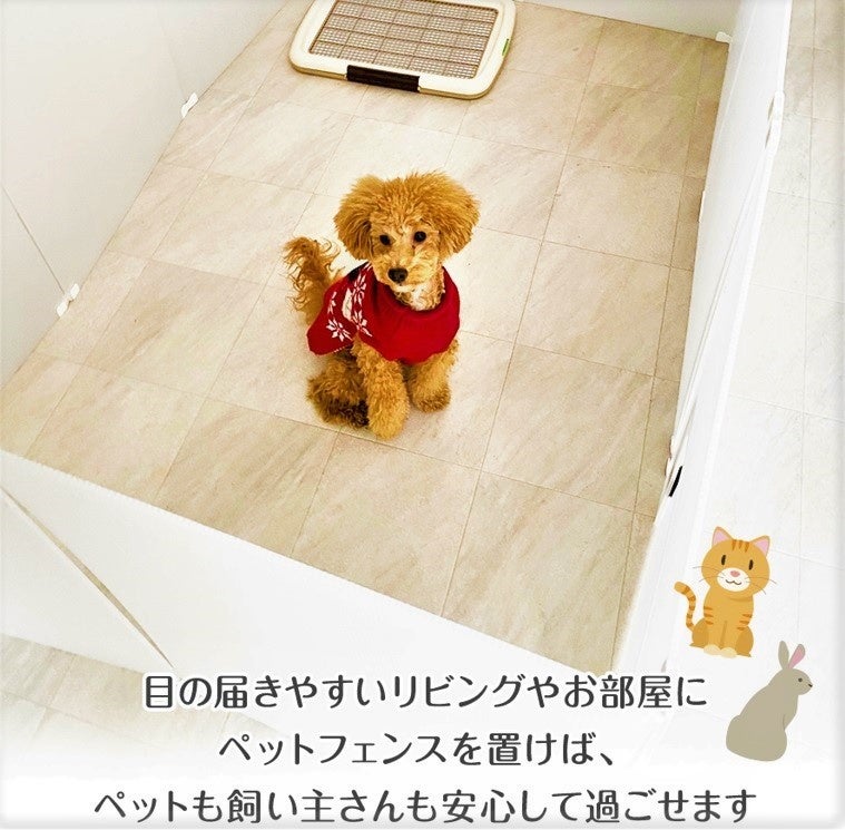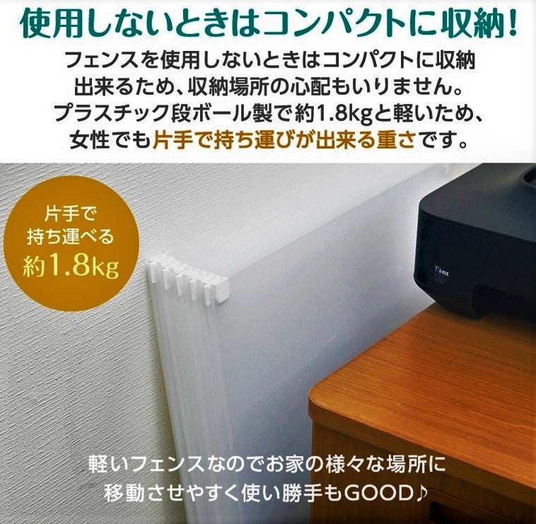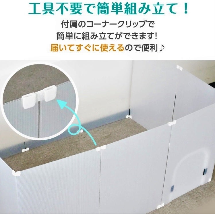 ◆目の届きやすいリビングやお部屋にペットフェンスを置けば、ペットも飼い主さんも安心して過ごせます。入り口にはペットが楽々通れる大きな扉付き♪扉はマジックテープで留める仕組みになっています。ペットをフェンスに入れる際、抱っこして持ち上げたりする必要も無く、扉を使用すればスムーズに中に入れることが出来ます。フェンスの中は広々とした空間になっているので、窮屈さも無く快適に過ごしやすいです。また、臆病なわんちゃんの隠れ家としても有効活用できます。◆犬(チワワ、ミニチュアダックスフンド、トイプードル、ヨークシャーテリア、マルチーズ、パピヨン、フレンチブルドッグ、ポメラニアン、柴犬)、猫(子猫、足の短い種類)、うさぎ、モルモット、フェレット、フェネックetc...。様々な種類のペットに対応できます。◆プラスチック段ボール製で約1.8kgと軽いため、女性でも片手で持ち運びが出来る重さです。軽いフェンスなのでお家の様々な場所に移動させやすく使い勝手もGOOD。フェンスを使用しないときはコンパクトに収納出来るため、収納場所の心配もいりません。別途追加でご購入されますとフェンスの面積をより広くお使いいただけます。◆付属のコーナークリップによってコの字やジグザグの形など、お好みによってフェンスの形を自由に変えられます。お好きな用途に合わせた使用が出来るため、使い道は無限通り・アイデア次第♪透けにくい半透明のプラスチック段ボール製のため、ペットフェンスの他に、ペットケージの目隠しや猫ちゃんのトイレの目隠しなど、生活の中のちょっと隠したい場所にも代用可能です!