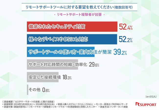 最後に、「リモートサポートツールに対する要望を教えてください(複数回答可)」と質問したところ、『徹底されたセキュリティ対策(52.4%)』と回答した方が最も多く、次いで『様々なデバイスやOSにも対応(52.2%)』『サポートツールの使い方・案内方法が簡潔(39.2%)』と続きました。