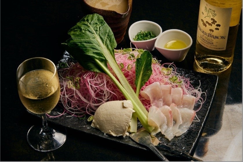 真鯛と大根は、“刺身とツマ”をイメージしました。色鮮やかな紅心大根で目にも楽しい一品。こちらもキャベツは不使用、真鯛の美味しさを堪能できる“和”なもんじゃです。