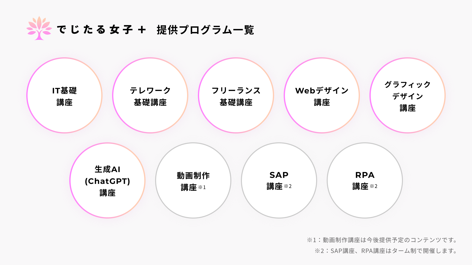 コロナ禍を経て一般化したテレワークに適応し、市場のニーズが高く単価も高いSAPやRPAなどのITスキルを身に着けることは、こういった悩みを抱える女性にとって選択肢を広げることにつながります。当社ではこれまで、地方自治体などと連携して「でじたる女子プロジェクト」としてこれらの悩みに対するスキル習得の支援を行ってきましたが、今回その支援をより一層広く提供するためにサブスクリプション制でプログラム提供を開始いたします。