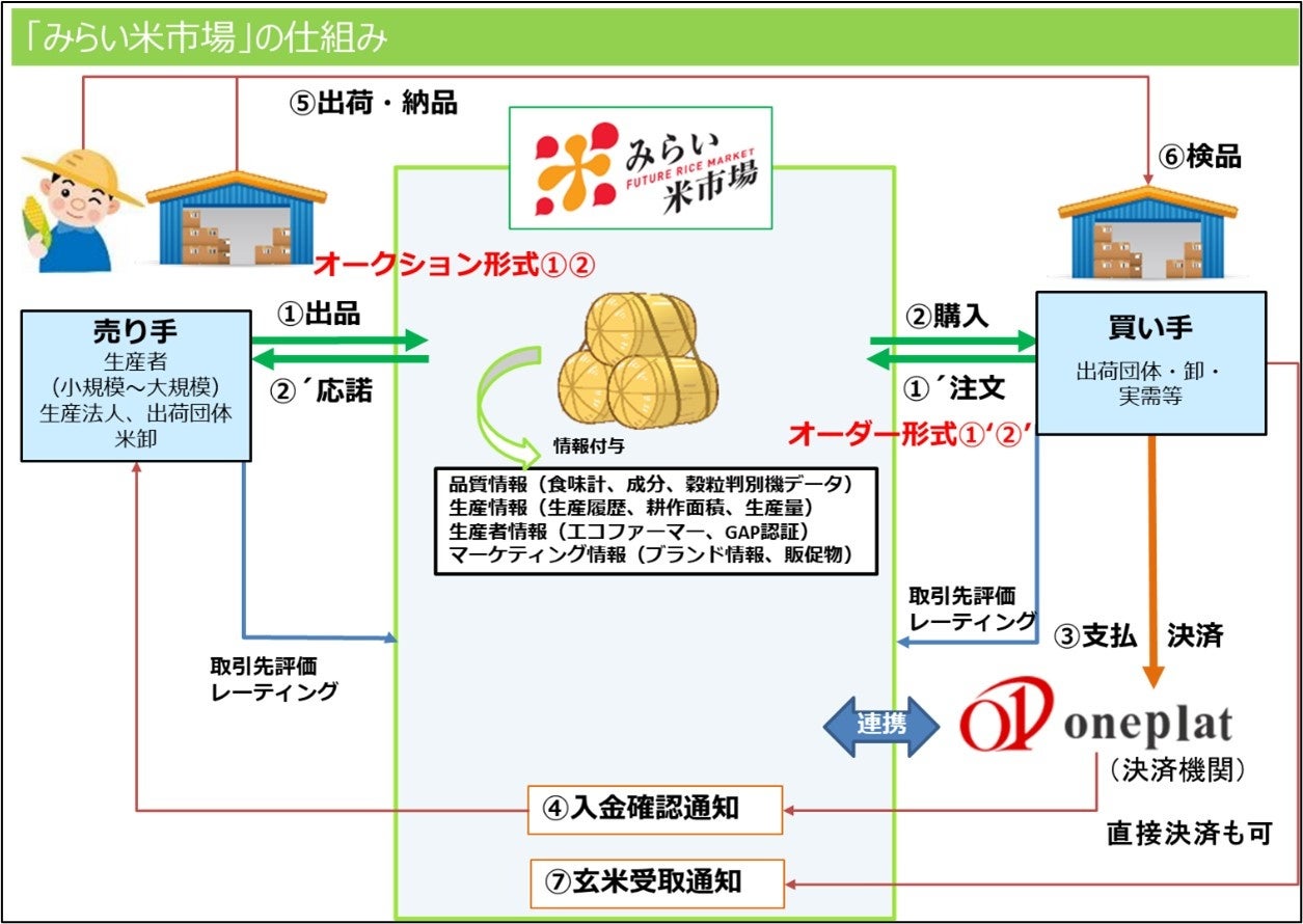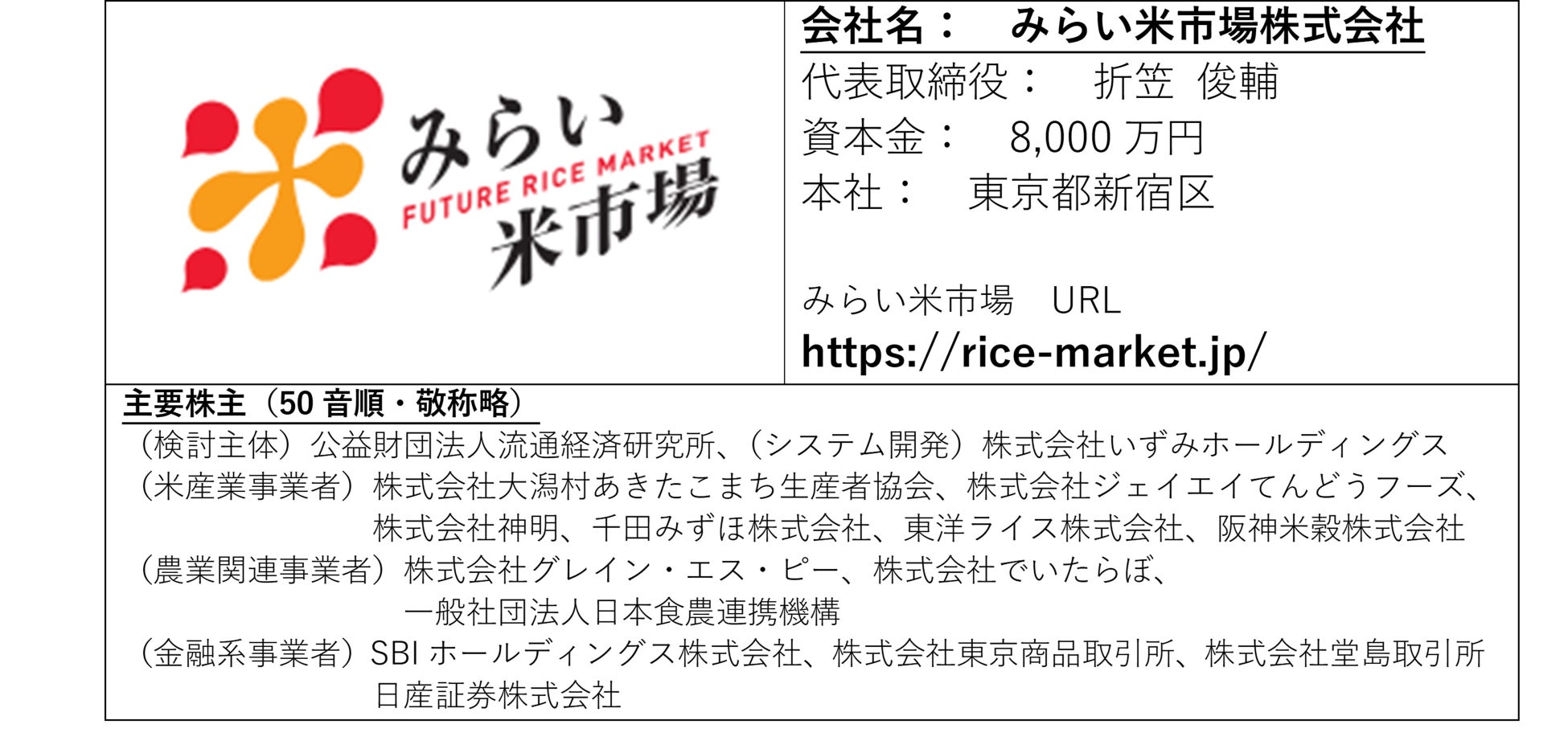 「みらい米市場」は、米の生産者、集荷事業者、卸売業者、実儒者等が参加者となって、オークション形式・注文方式(買い手からのオーダー形式)で米の売買ができるオンラインマーケットとして開設されます。運営は、米産業の事業者、金融業の事業者からの出資を受けた みらい米市場株式会社(本社:東京都新宿区、代表取締役:折笠 俊輔)が行います。