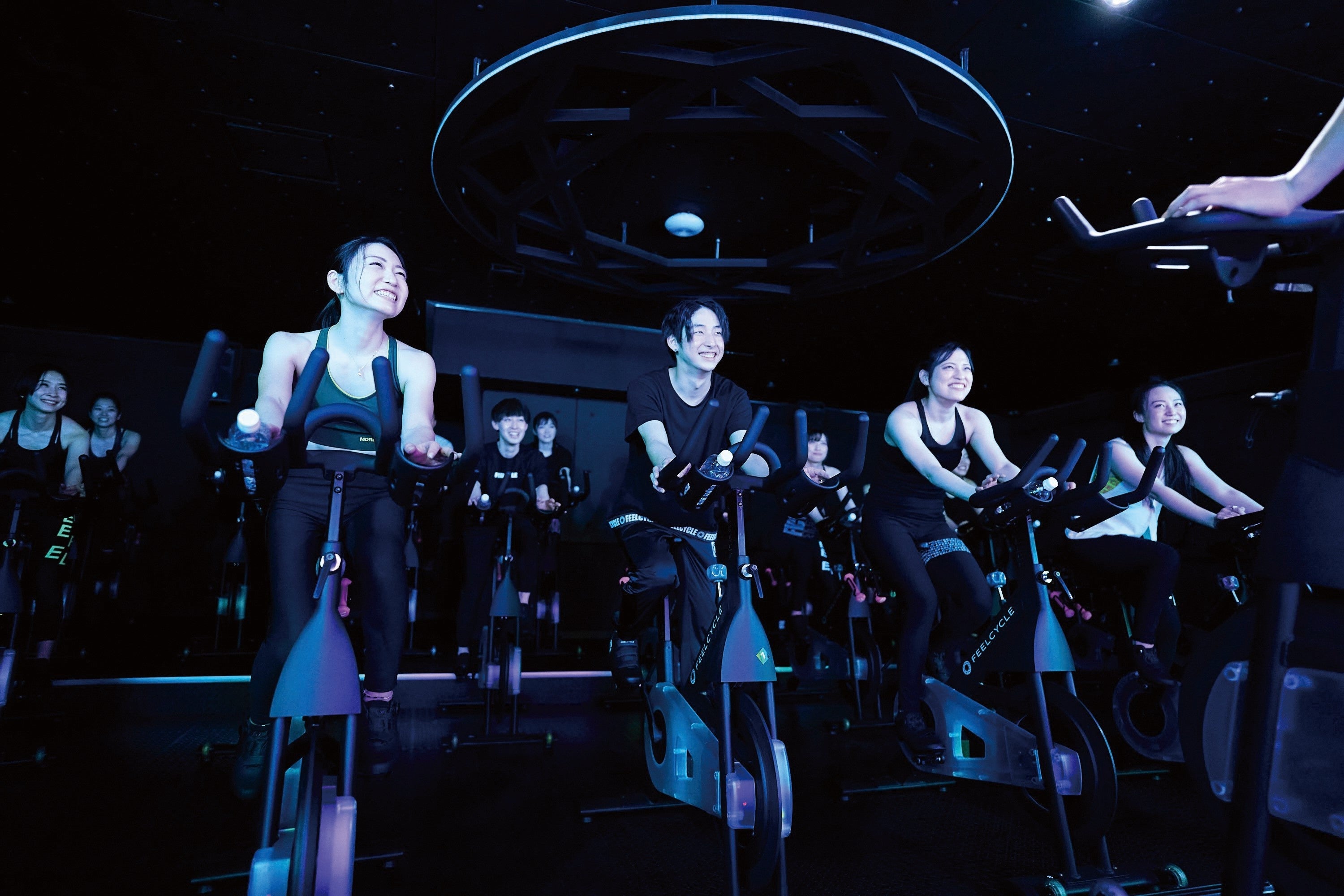 FEELCYCLEは、全国に40店舗以上*を展開する暗闇バイクエクササイズスタジオのパイオニアです。提供プログラムは、有酸素運動と筋力トレーニングの両要素を組み合わせ、効率的な脂肪燃焼が叶うように設計されており、45分のレッスンで約800kcal(※1)を消費するだけでなく、アフターバーン効果(※2)を含めると、更なるカロリー消費が期待できます。また、全プログラムにおいて、下半身だけでなく上半身を用いた全身運動が含まれているため、高い運動効果も見込まれます。