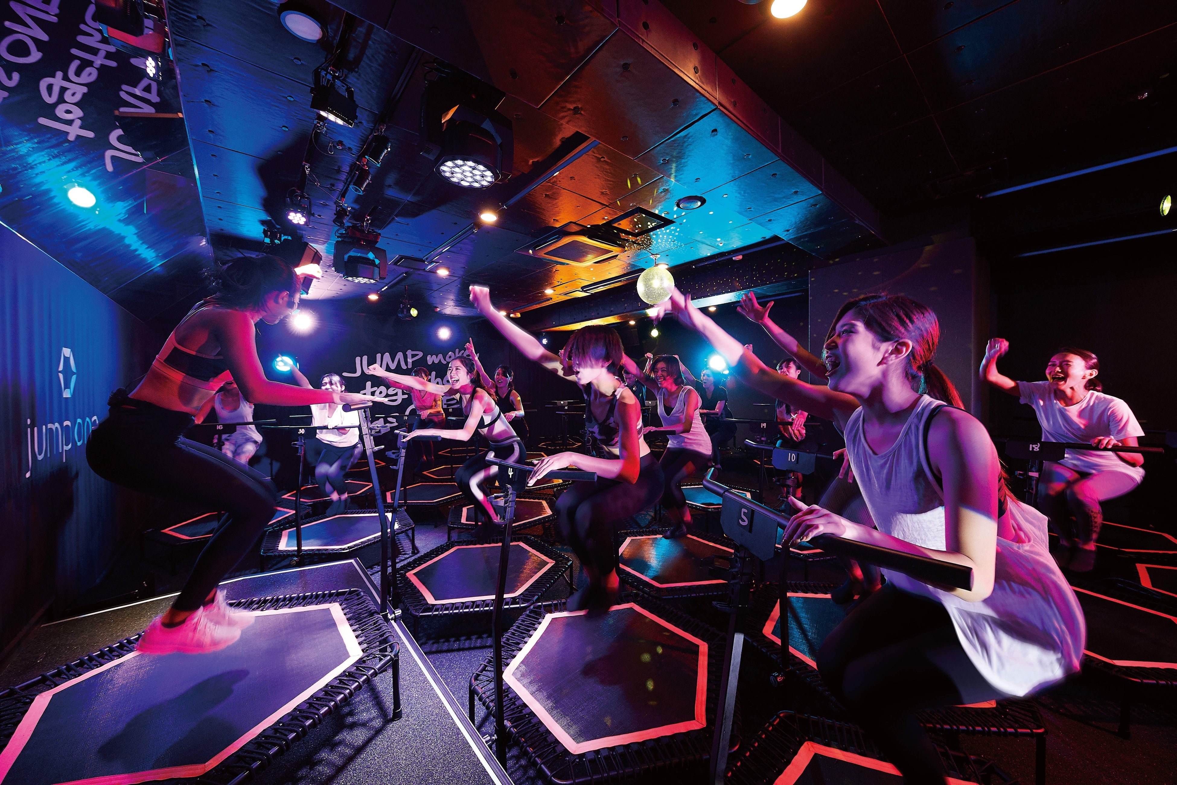 jump oneは、全国に15店舗以上*を展開する暗闇トランポリンスタジオです。トランポリンを使用してバランスをとりながら、音楽に合わせジャンプを繰り返すプログラムを提供。柔らかいマット上での上下運動により、短時間で効率的に体幹を鍛えることができ、全身運動による基礎代謝アップやダイエット効果も同時に期待できます。心を動かすインストラクターの演出・暗闇・照明・大音量の音楽により日常から解放されるような特別感を味わえます。