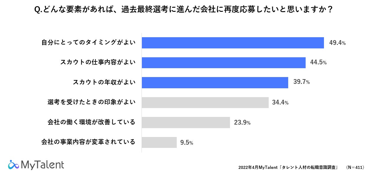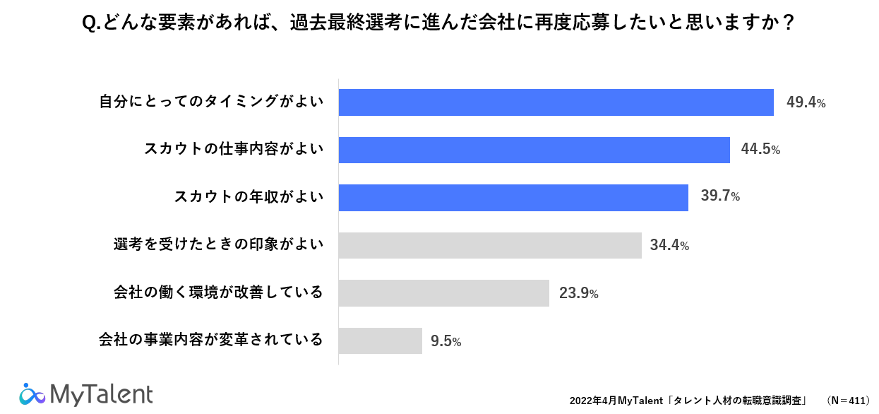 - 実際に再応募する要素としては、「タイミング」、「想定している仕事内容」、「年収」の影響が大きい