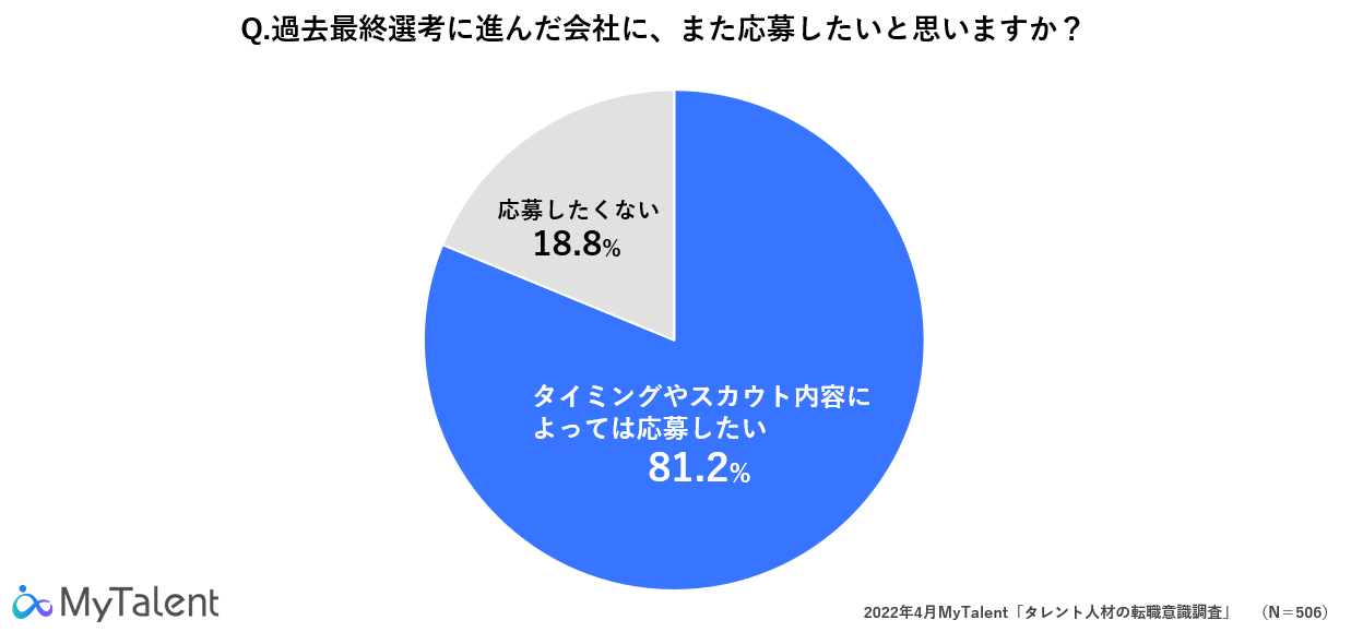 - 過去最終選考に進んだ会社に、タイミングやスカウトの内容によっては再応募したいと考えている人が8割