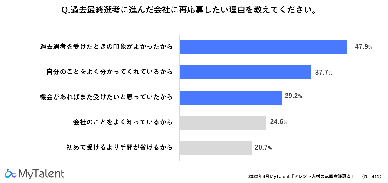 再応募したいと思う理由は、「選考時の印象がよかった」(47.9%)、「自分のことをよく分かってくれているから」(47.9%)、「機会があればまた受けたいと思っているから」(29.2%)となっています。候補者体験が鍵になると明らかになりました。