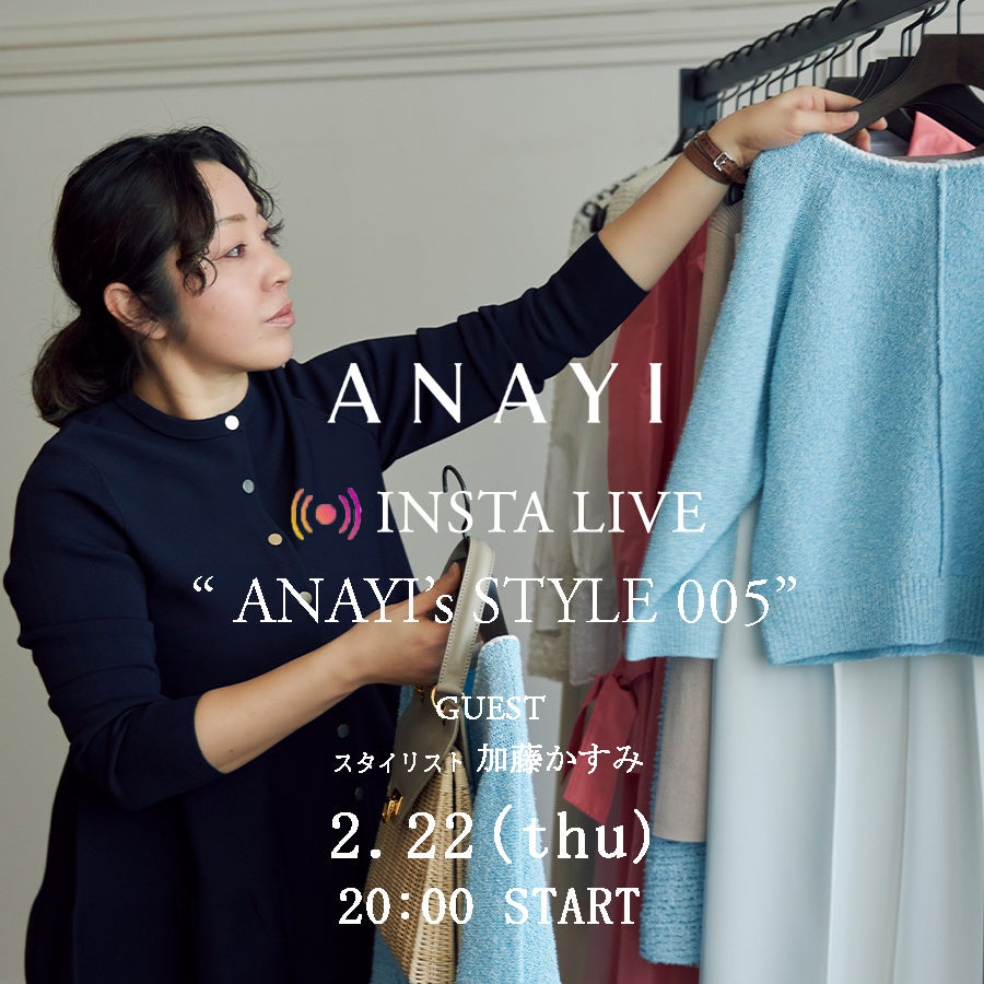 2/22(木)20時より配信スタート。ANAYI’S STYLEにご出演いただいた加藤かすみさんをゲストにお迎えし、スタイリングのポイントや、着回しテクニックなどをお伺いします。