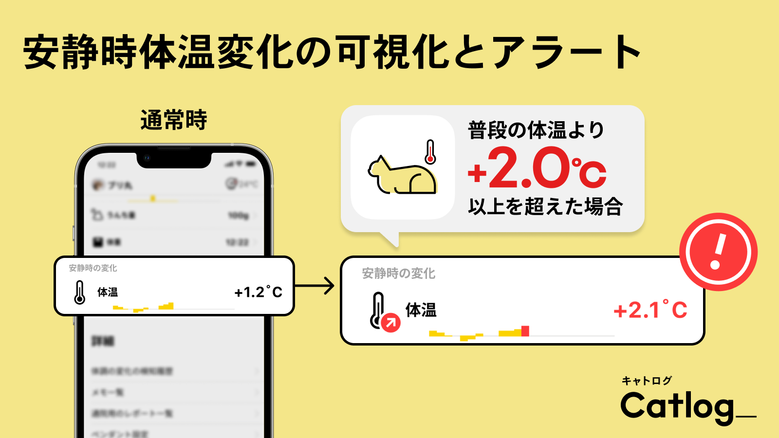 『Catlog』にて計測する猫様の安静時体温を時間ごとに表示し、普段の体温と比較して+2.0℃以上を超えた場合は、アラートにて飼い主さんにお知らせいたします。