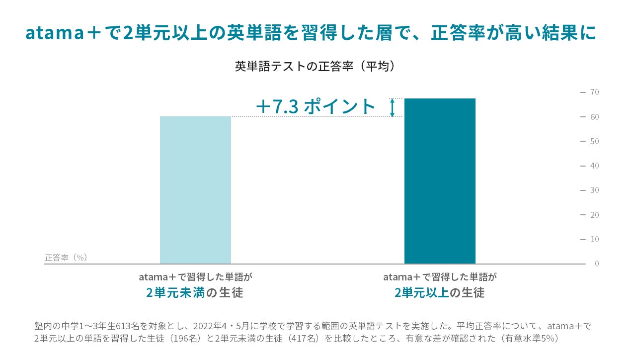中学生を対象にした英単語テストにおいて、atama+で2単元以上の単語を習得した生徒の平均正答率は、2単元未満の生徒と比較して7.3%ポイント上回る結果となりました。また、生徒の学力層別に比較しても全ての層において正答率が向上していることが確認できました。生徒のアンケートでは「楽に単語を覚えられる」「間違えたところを繰り返し勉強でき、発音やスペルが正確にわかる」といったポジティブな感想を得られました。