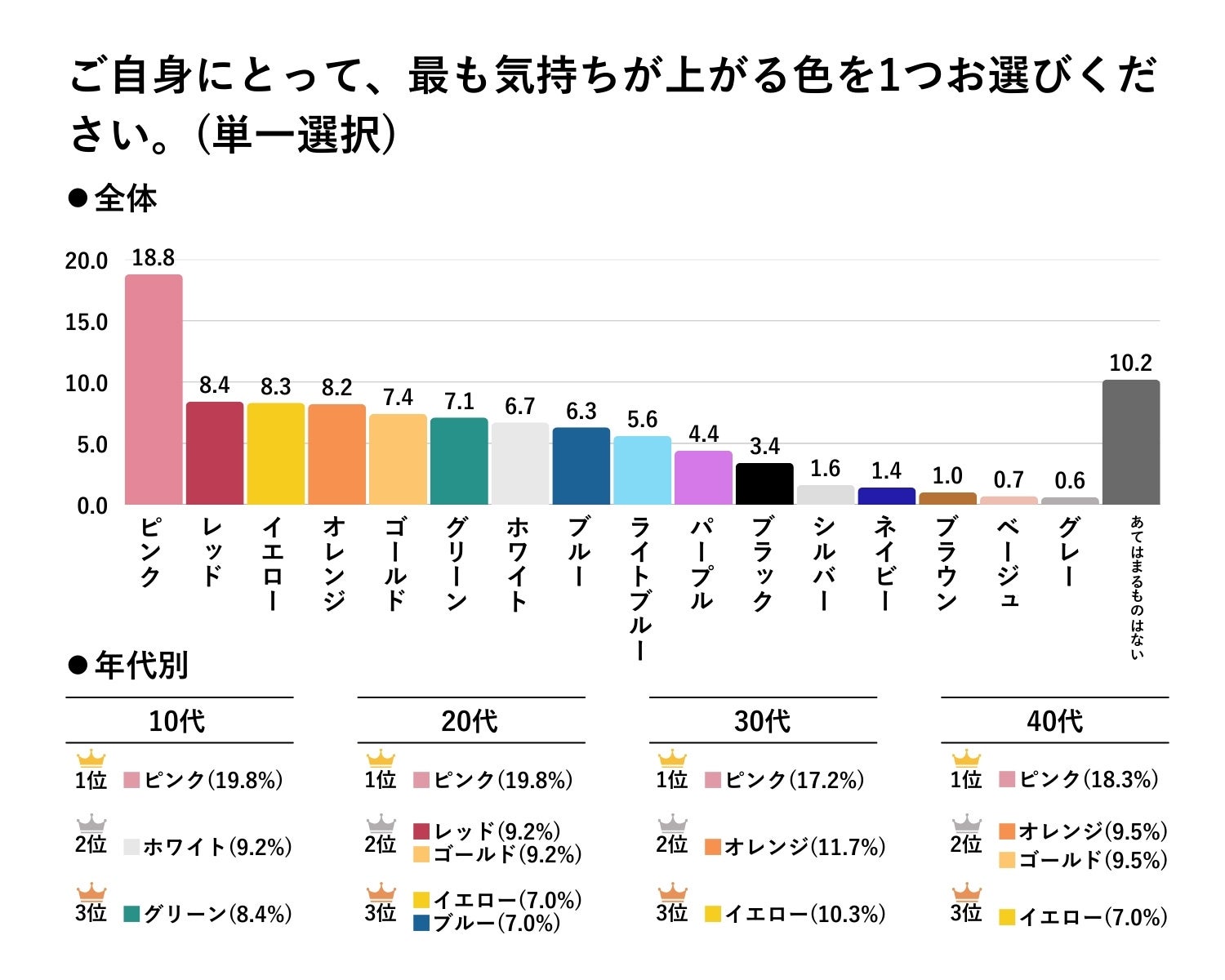1位「ピンク」(18.8%)、2位「レッド」(8.4%)、3位「イエロー」(8.3%)。全年代で支持が「ピンク」に集中し、2位以下は各年代で異なる色のランキング結果となった。