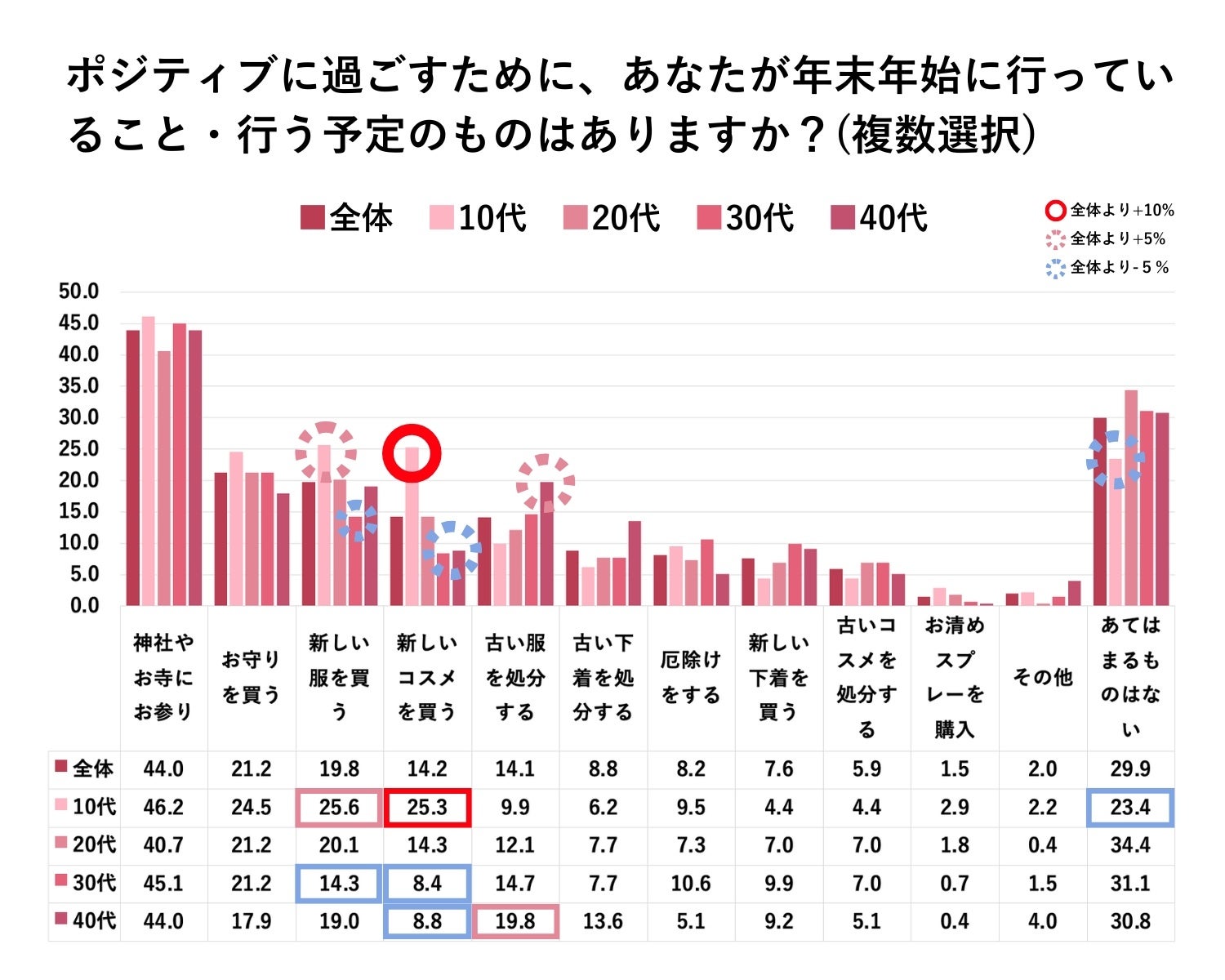 ポジティブに過ごすために年末年始にする行動、全年代で4割強が「神社やお寺へのお参り」と回答。10代は服・コスメの購入、40代は断捨離の傾向