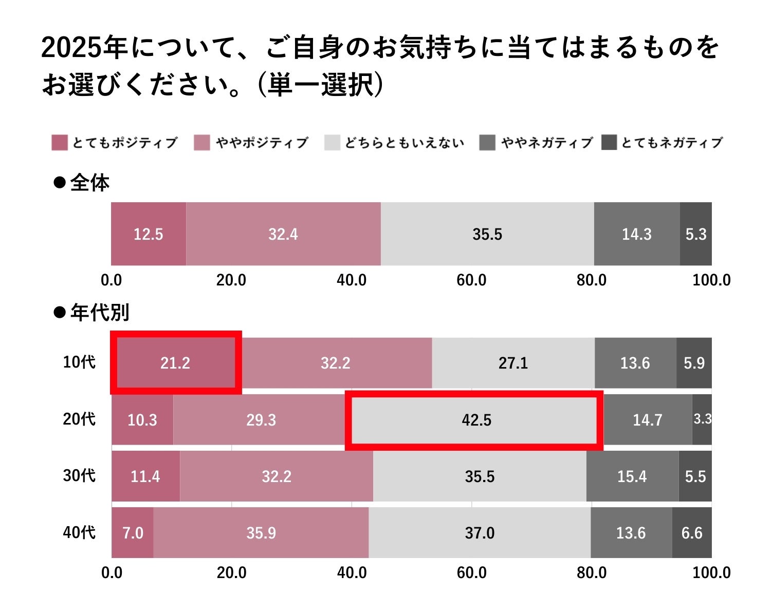 2025年に対して、全体の44.9%がポジティブ。10代はポジティブ派が過半数。20代は中立派が4割強