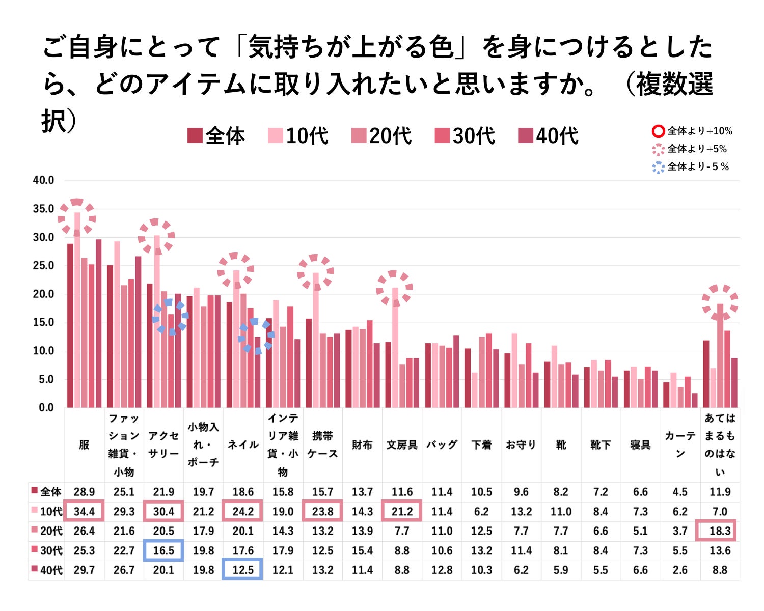 気持ちが上がる色を取り入れたいアイテムは、全年代で「服」が1位。10代は文房具・携帯ケースなど身近な小物に取り入れる傾向