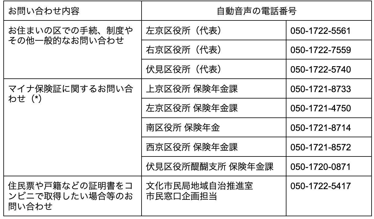 (*)2024年11月から京都市国民健康保険の加入者宛に順次発送する「保険証廃止後のマイナ保険証の取扱い」に関するお知らせのお問い合わせ窓口となります。(実施期間:2024年12月31日まで)