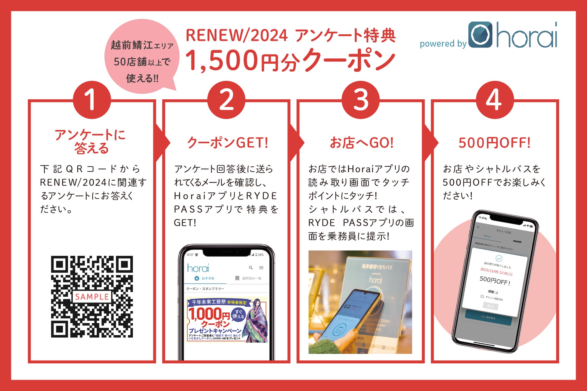 調査スキーム:アンケート回答者へ抽選で越前鯖江エリア内の店舗・施設や、RENEWシャトルバスで使用できるデジタルクーポンを配布し利用していただく