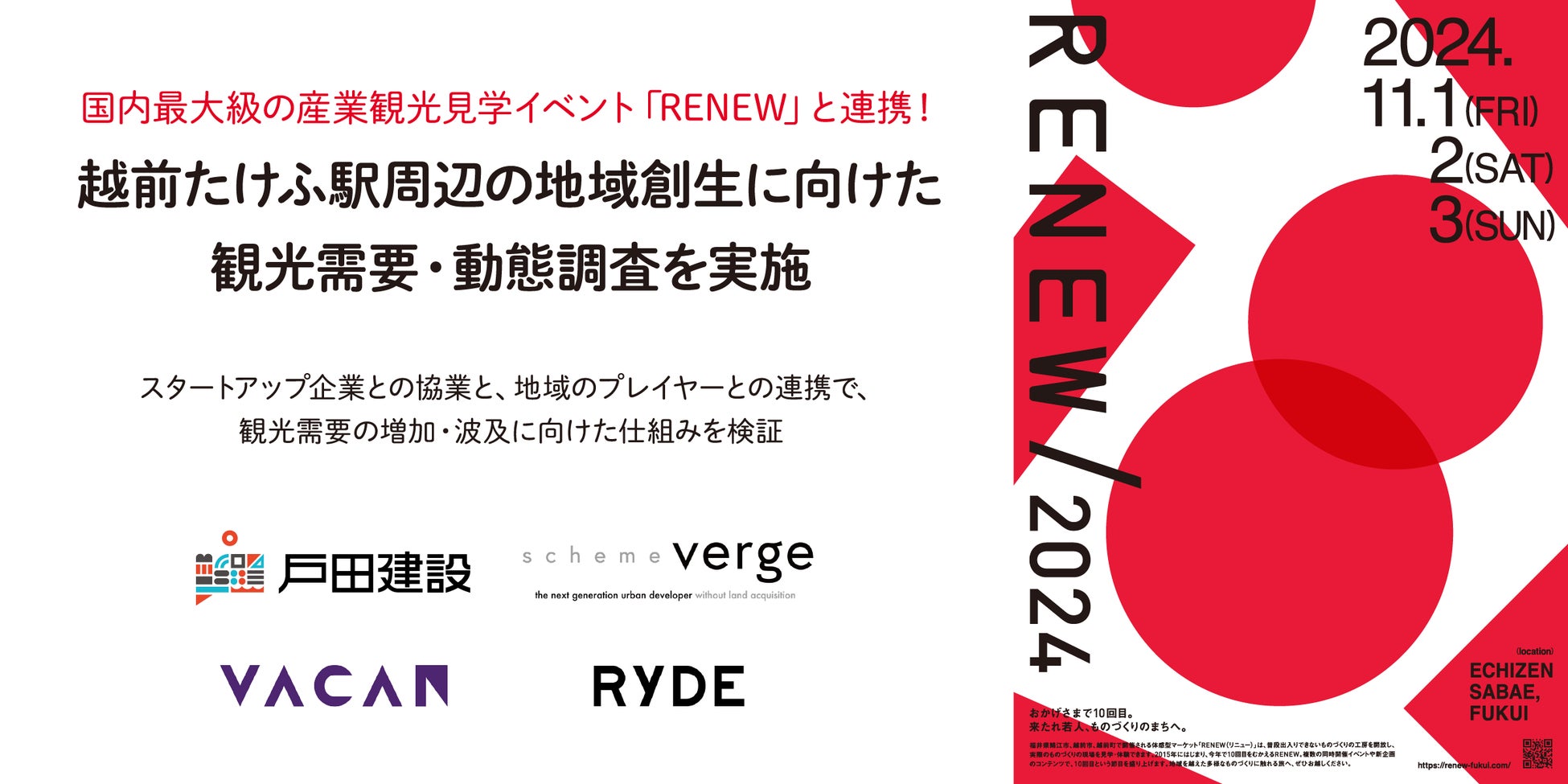 scheme verge株式会社(CEO:嶂南 達貴、以下「scheme verge」)と戸田建設株式会社(社⻑:大谷 清介、以下 「戸田建設」)は、国内最大の産業イベント「RENEW」と連携し、北陸新幹線 越前たけふ駅を拠点とする福井県丹南地域の観光促進に向けたエリア連携型の観光需要・動態調査を実施します。