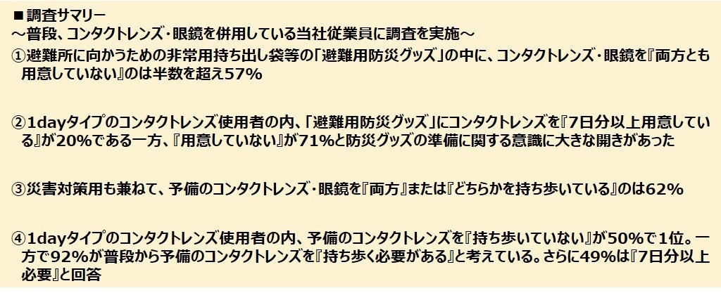 従業員の約6割が災害対策用も兼ねた予備のコンタクトレンズ・眼鏡の「両方またはどちらかを持ち歩いている」と回答 ~コンタクトレンズは『非常用持ち出し袋』に1~2週間分を準備しておきましょう~
