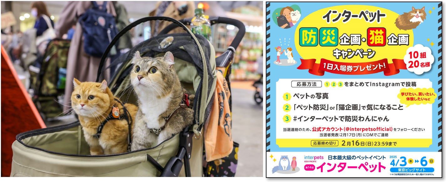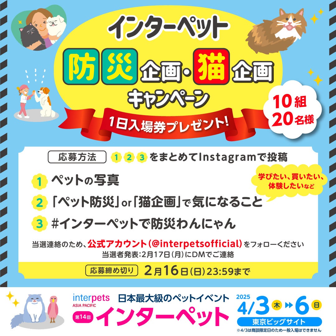 インターペット公式インスタグラムでは2月18日(火)の入場券販売に先駆け、「インターペット防災企画・猫企画キャンペーン」を実施中です。指定の内容を投稿すると、抽選で10組20名様に1日入場券が当たります。応募受付は2月16日(日)まで。