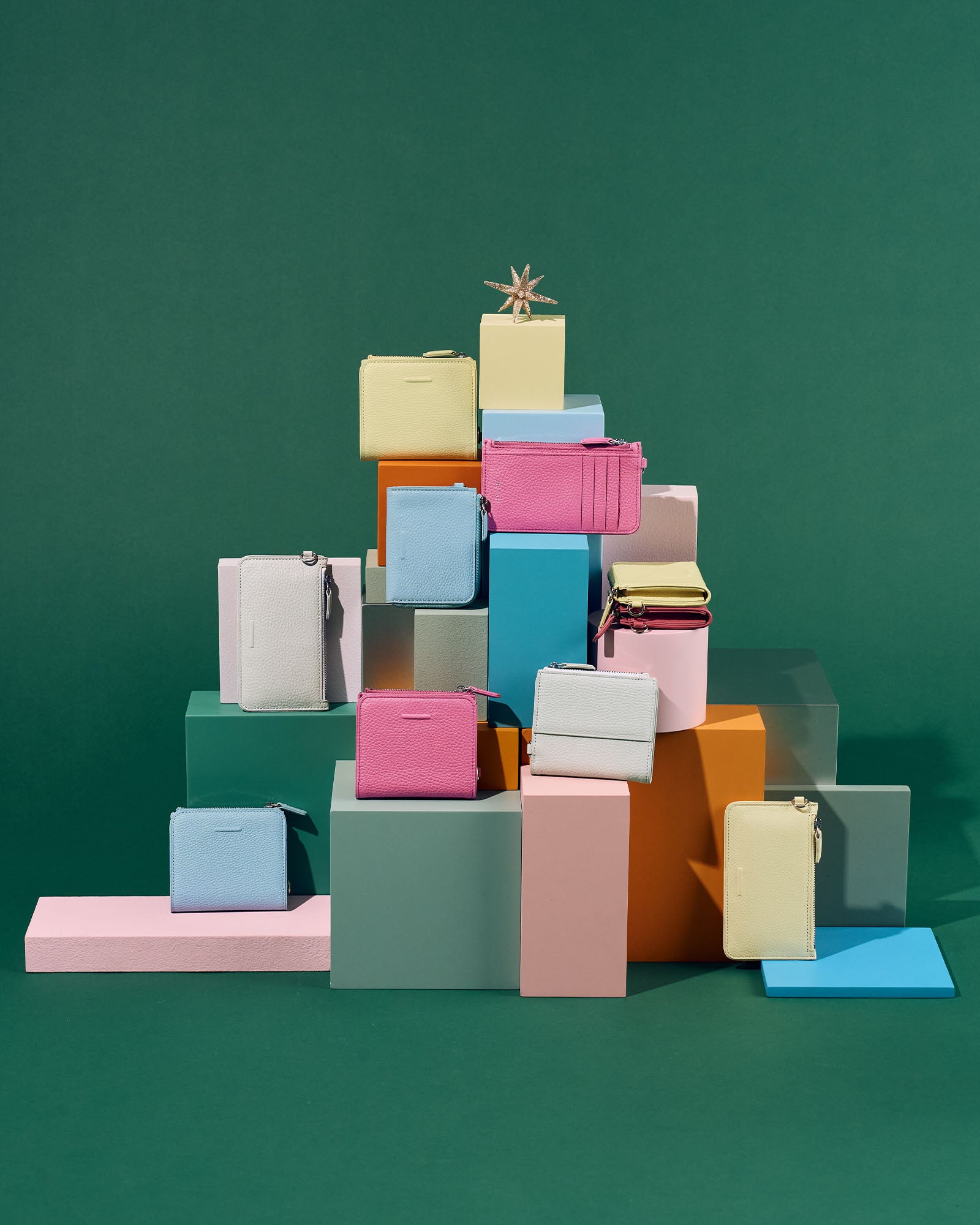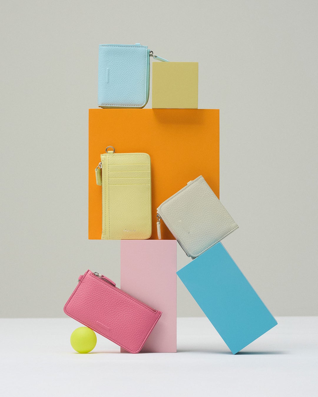 ベーシックなブラック・マシュマロに加え、ショッキングピンク・バターイエロー・ライトブルーというカラフルなラインナップも展開。小物で取り入れやすい明るく鮮やかなトーンは、持ち歩く際の気持ちも高揚するカラーリングです。