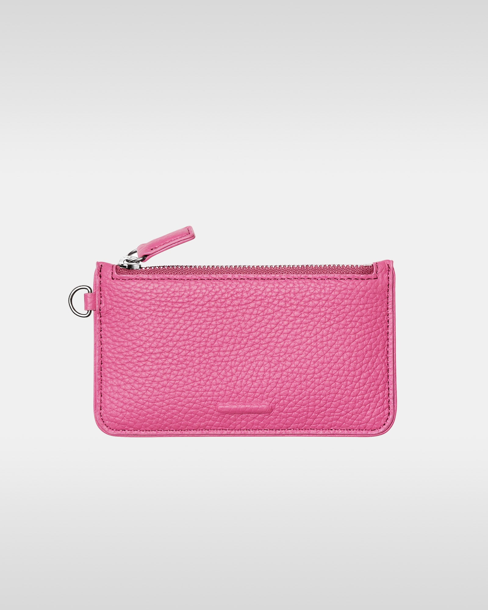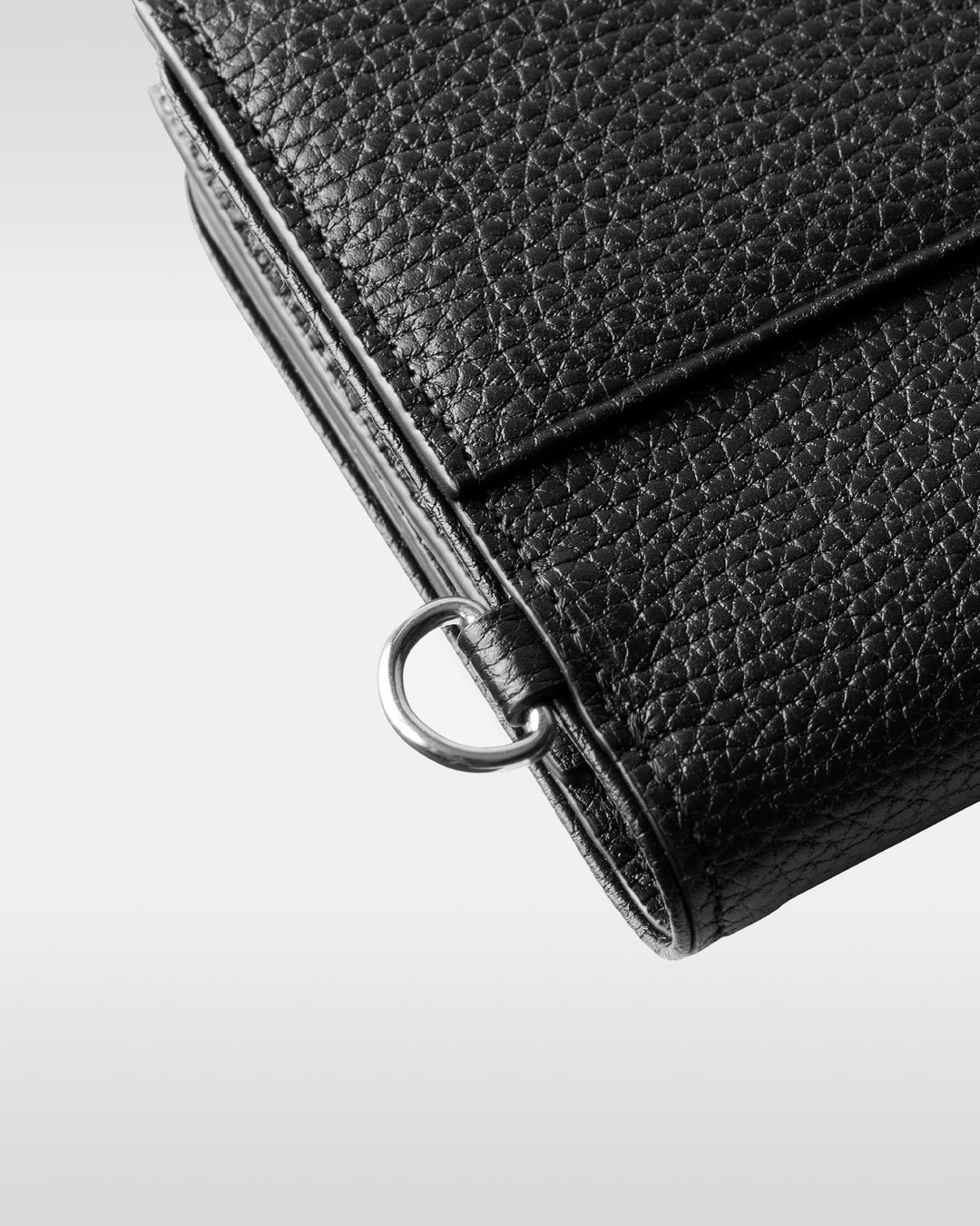 女性の手でもしっかりホールドできるサイズ感とスリムさを保ちつつ、表面はふっくらしたシルエットを残した『マイクロフラグメントケース』。背面にはスリーブも搭載し、折りたたんだ紙幣やレシートなどへのアクセスもスムーズ。